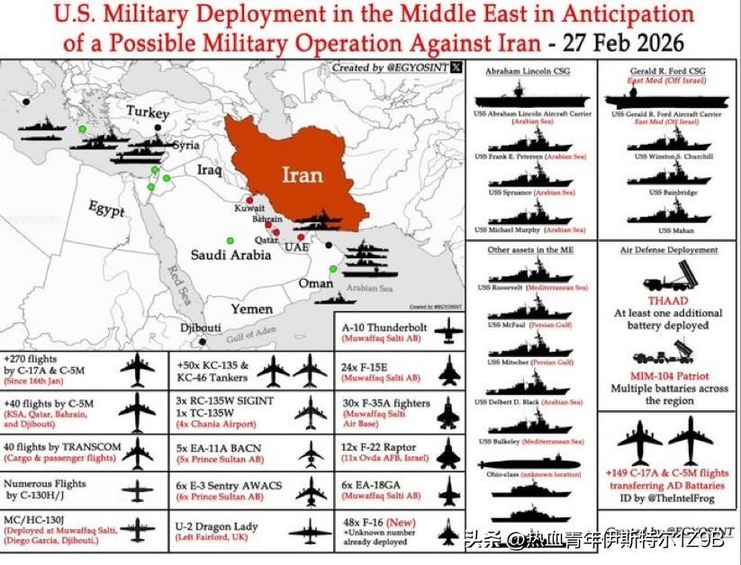 为应对可能对伊朗发动的袭击,美国和以色列已在中东地区部署了 500 多架攻击机和 200 多架支援机。 准备工作包括: 约100架第五代战斗机(F-22、F-35) 最多可达100架空中加油机 约20架预警机 18架电子战飞机 数十架侦察机和特种任务飞机 多艘美国海军驱逐舰和航母舰载机联队美军攻打伊朗