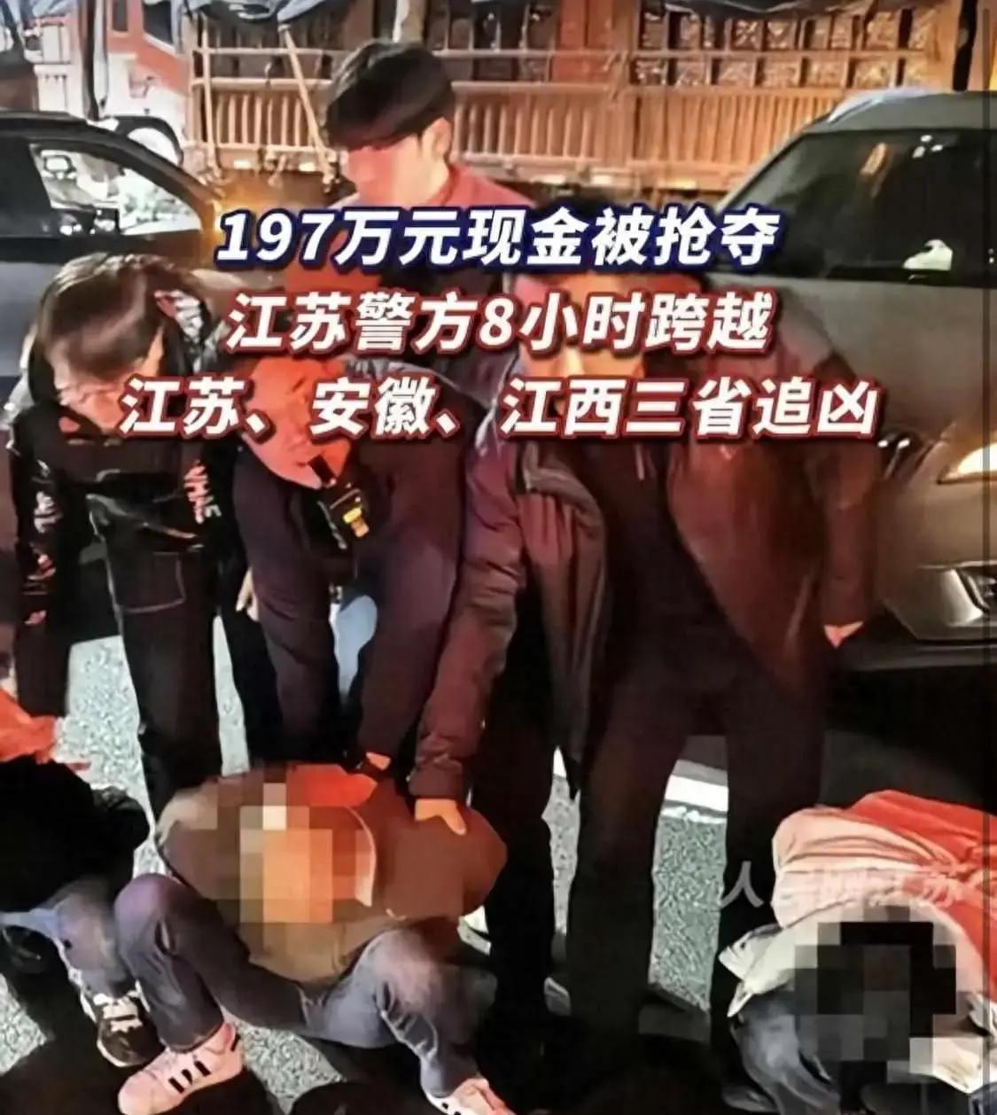 太解气!197万特大抢劫案,警方8小时极速破案 2026年江苏发生全国最大金额现金抢劫案,4名劫匪抢走工人工资197万,精心策划跨省逃窜,以为能逍遥法外。 没想到现在天网+智能警务太厉害,现金带溯源、手机有定位,就算换车牌改外观,也全程被锁定。 民警一路追踪到江西高速口,当场人赃并获,197万分文不少。 这4人多半要蹲十年以上,真是最蠢的犯罪。 天网恢恢疏而不漏,想靠抢劫发财,下场只会是自毁一生!为人民警察点赞!抢劫罪