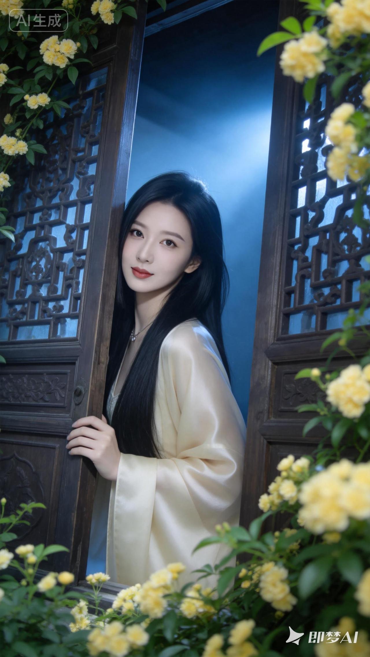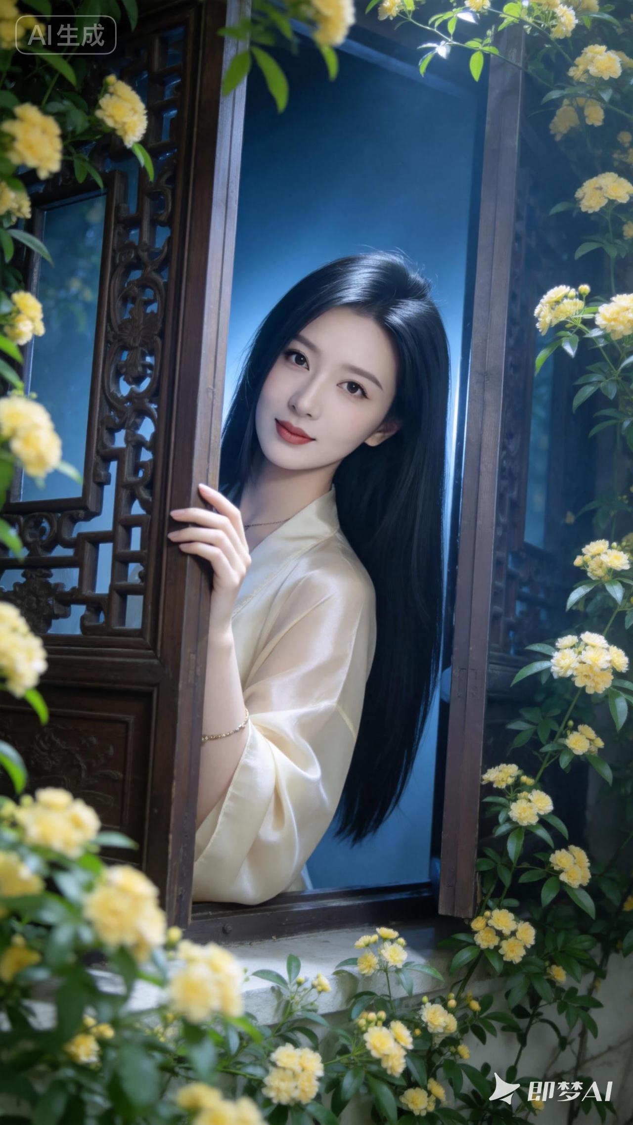 优雅东方美人,花影摇曳间,尽显古典韵味。