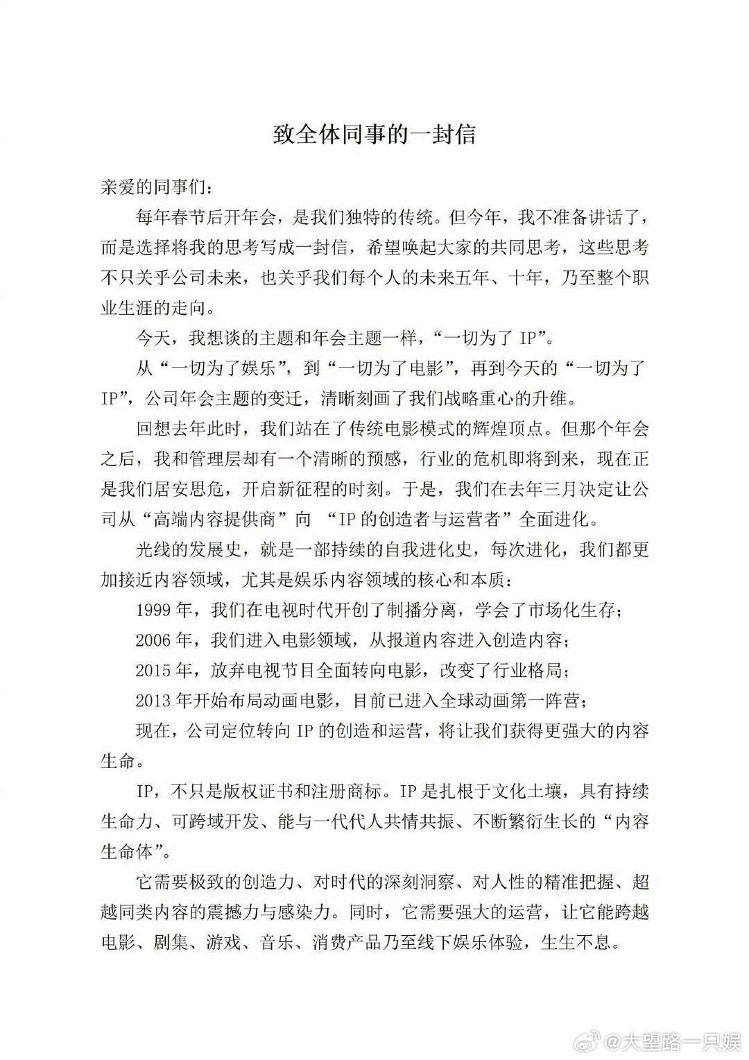 光线传媒董事长王长田致全体同事的一封信曝光,主题为“一切为了IP”,期待一手《哪