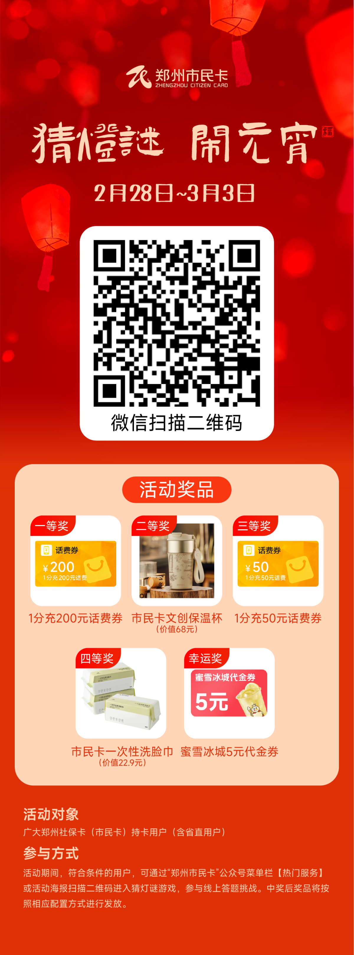 据了解,本次猜灯谜活动内容涵盖社保卡多功能应用、郑州市民卡各项服务以及传统元宵灯谜等,旨在通过趣味互动,增进大家对郑州社保卡(市民卡)便民惠民应用的了解。活动满分为100分,得分达80分即可参与抽奖。奖品共设置五档,分别为1分充200元话费券、郑州市民卡文创保温杯、1分充50元话费券、郑州市民卡加厚洗脸巾(60抽*3包)以及蜜雪冰城5元代金券。每人每日5次挑战机会,活动期内每人最多中奖1次。中奖者须在3月5日12时前进入游戏兑奖页面填写领奖信息,奖品将按照相应配置方式进行发放。