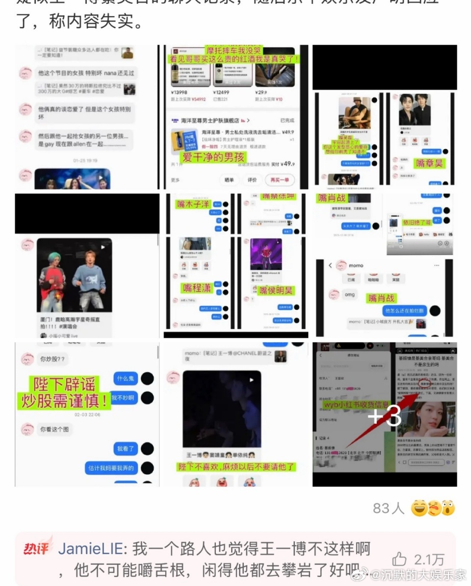 到底谁在信王一博会买9块9的核桃,二.手500块的衣服,300块的鞋子?就很离谱啊!其他买的都那么便宜,突然买个酒买这么贵?他有这个钱你说他买攀岩装.备都比买红酒更可信好吧!而且他每天忙到飞起,哪来的时间天天和别人嘴其他艺人啊,就别给王一博造这种谣了 王一博 穷谣王一博聊天记录