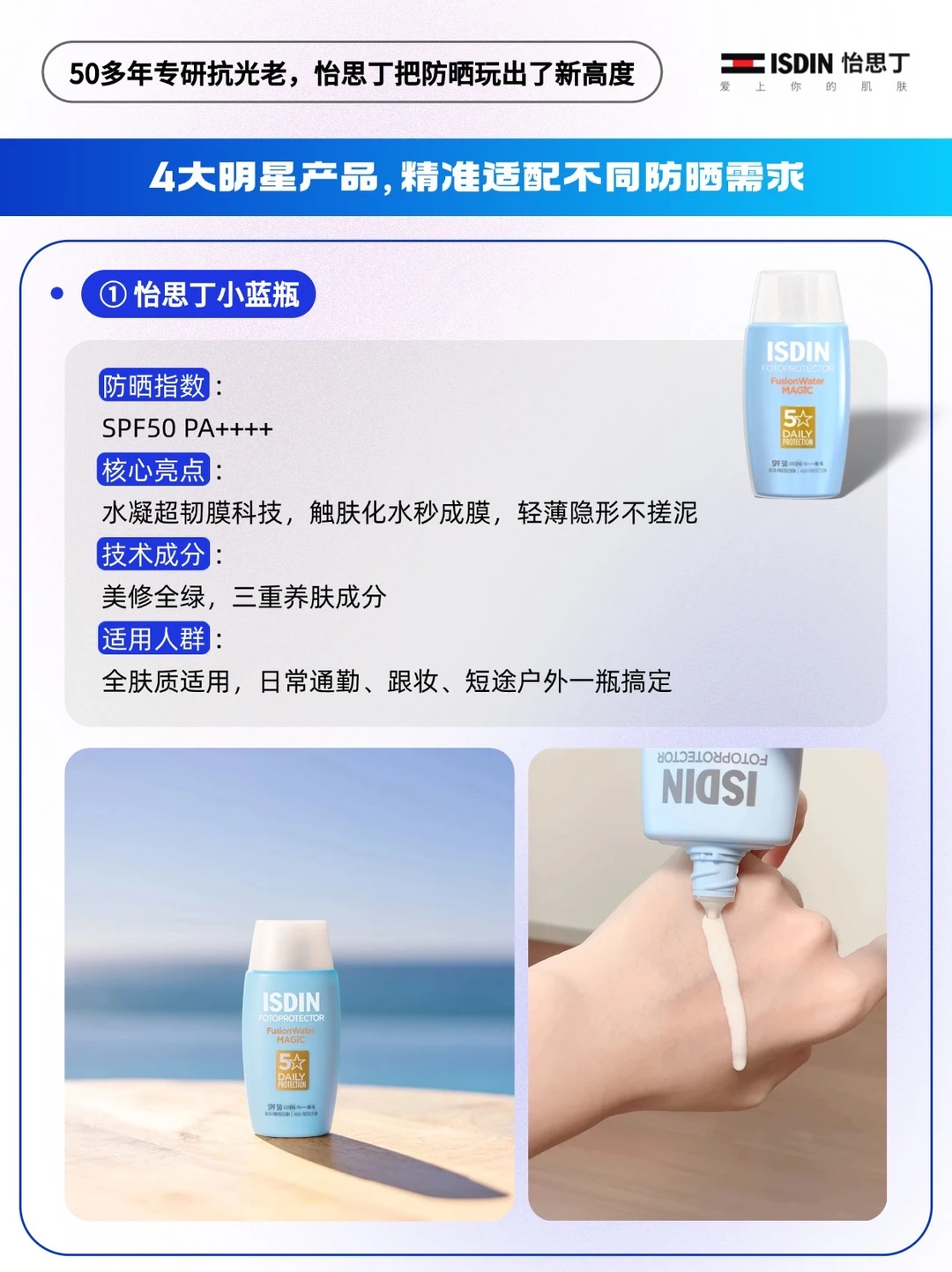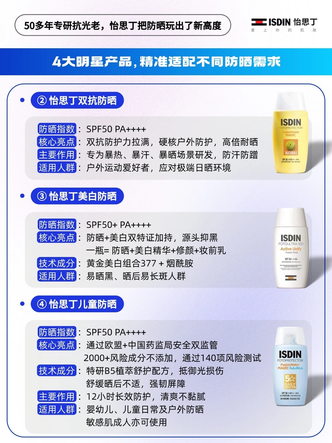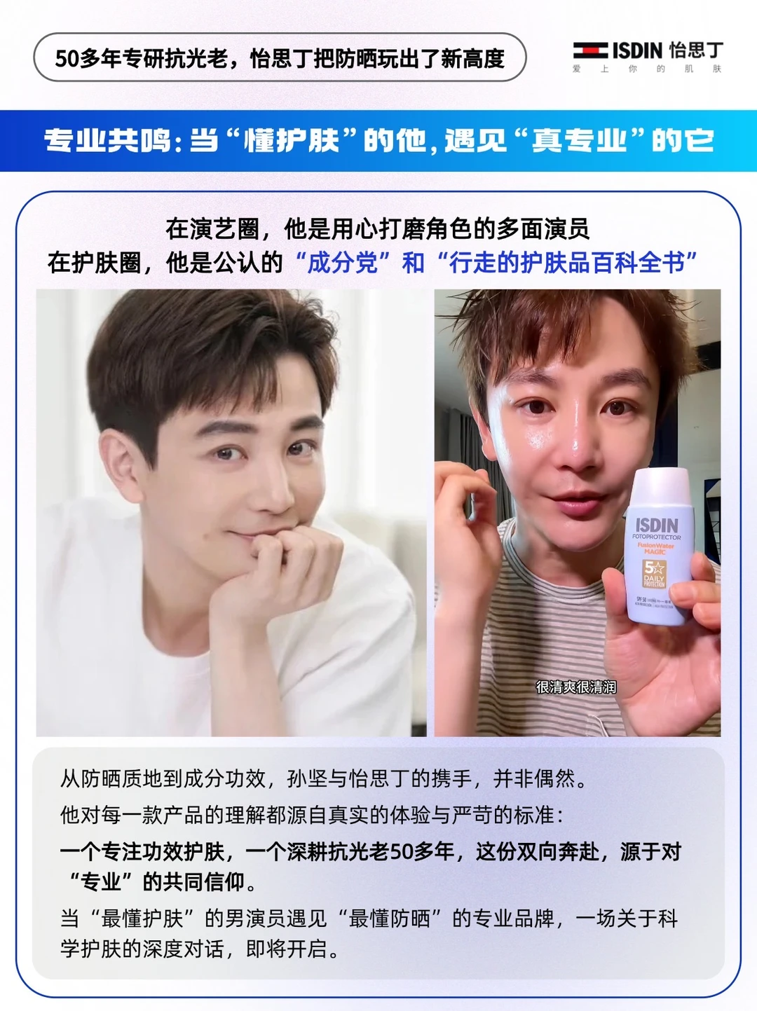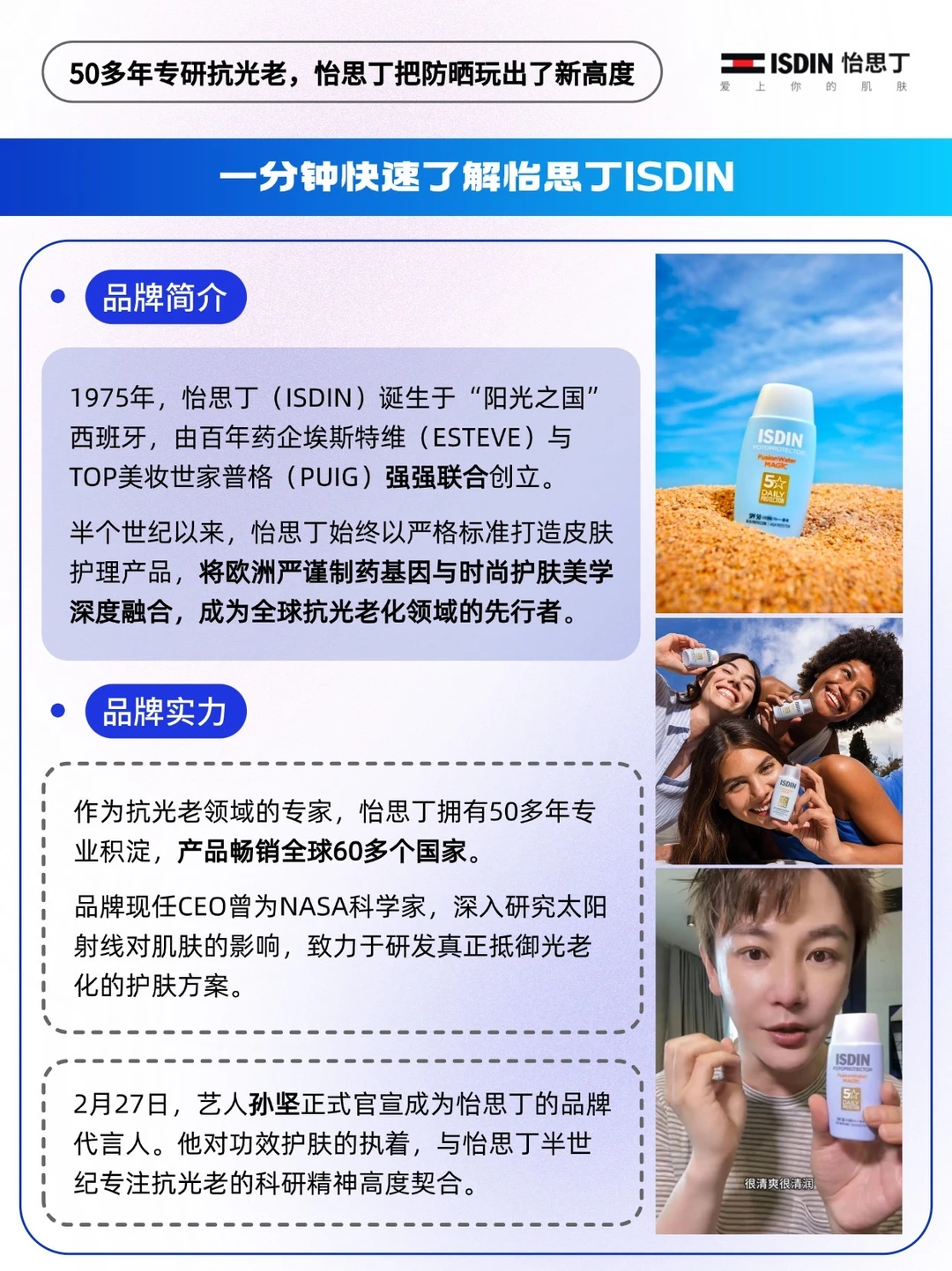 - 提到防晒,就绕不开深耕半世纪的西班牙品牌——ISDIN怡思丁。 🔵它背靠百年医药健康企业Esteve与美妆巨头Puig,自创立起便将制药级标准融入产品研发。 🔵品牌携手全球5万余名皮肤学专家,斩获238项专利,2026年更携手“护肤行家”孙坚为品牌代言人。 🔵怡思丁跳出“防晒仅阻隔紫外线”的单一认知,50多年深耕「抗光老化」研究,将防晒升级为光损伤防护与老化预防的核心环节,产品畅销全球60多国,是名副其实的专业防晒标杆[赞R]