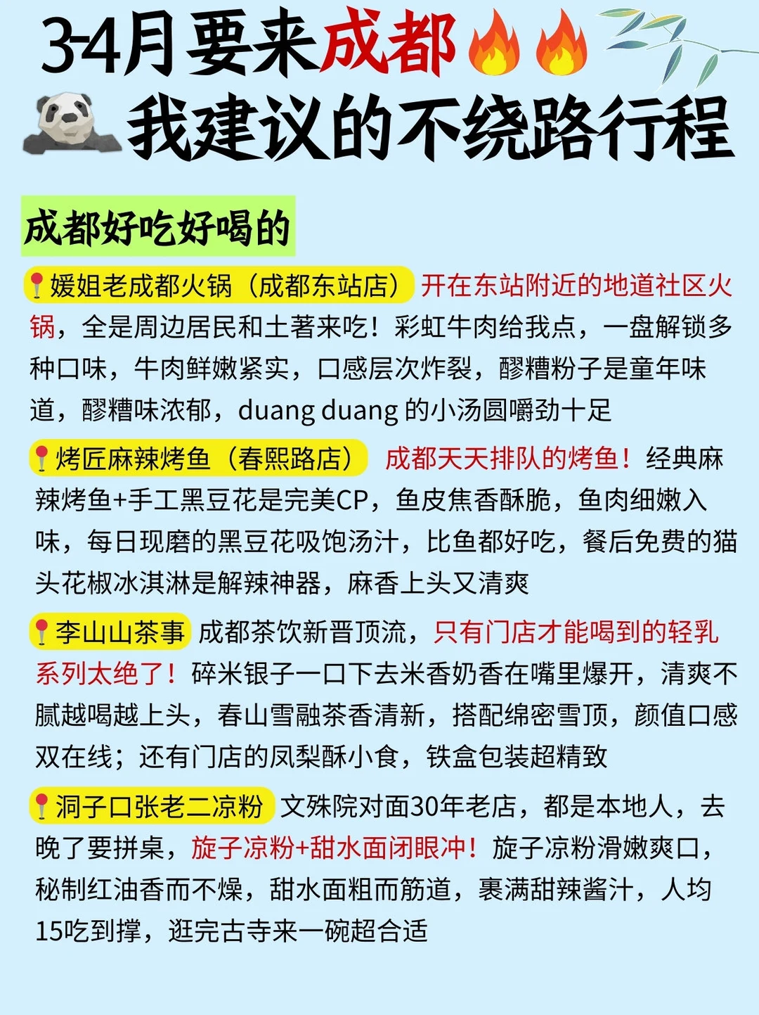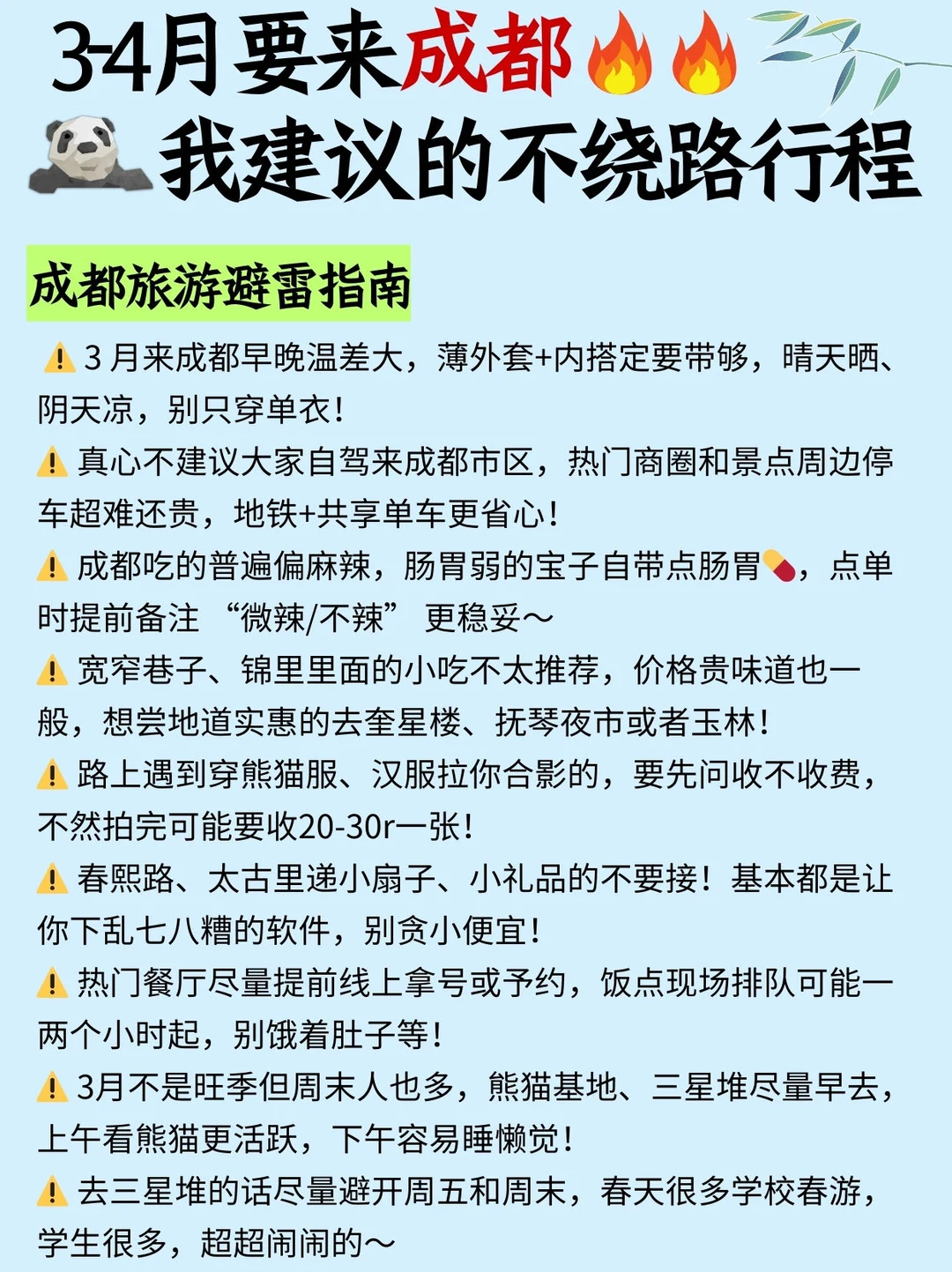 家人们!是谁去成都不知道怎么玩呀❓熬夜整理了这一篇不绕路行程,拿走不谢😁 - ⭕️旅行小tips ✔3 月来成都早晚温差大,薄外套+内搭定要带够 ✔真心表自驾来成都市区,热门商圈和景点周边停车超难还贵 ✔热门餐厅尽量提前线上拿号或予约,饭点现场排队可能一两个小时起 ✔去三星堆的话尽量避开周五和周末,春天很多学校春游,学生很多 ✔3月不是旺季但周末人也多,熊猫基地尽量早去,避开人群 - ⭕️成都好吃好喝~ ✔媛姐老成都火锅(成都东站店):开在东站附近的地道社区火锅,全是周边居民和土著来吃! ✔烤匠麻辣烤鱼(春熙路店):成都天天排队的烤鱼!经典麻辣烤鱼+手工黑豆花是完美CP ✔李山山茶事:成都茶饮新生代,只有门店才能喝到的轻乳系列太绝了! - 🏠更多资讯看这里~