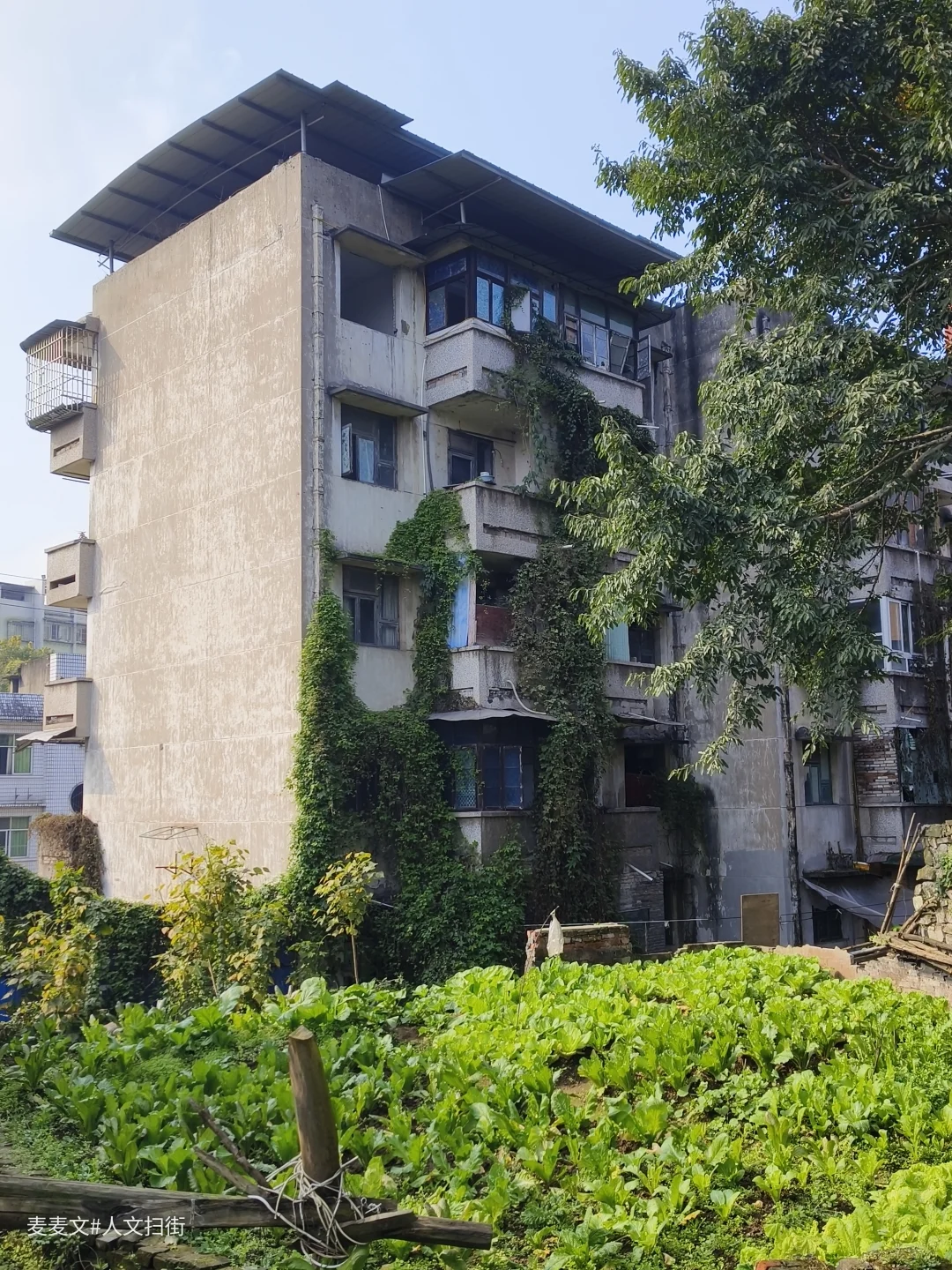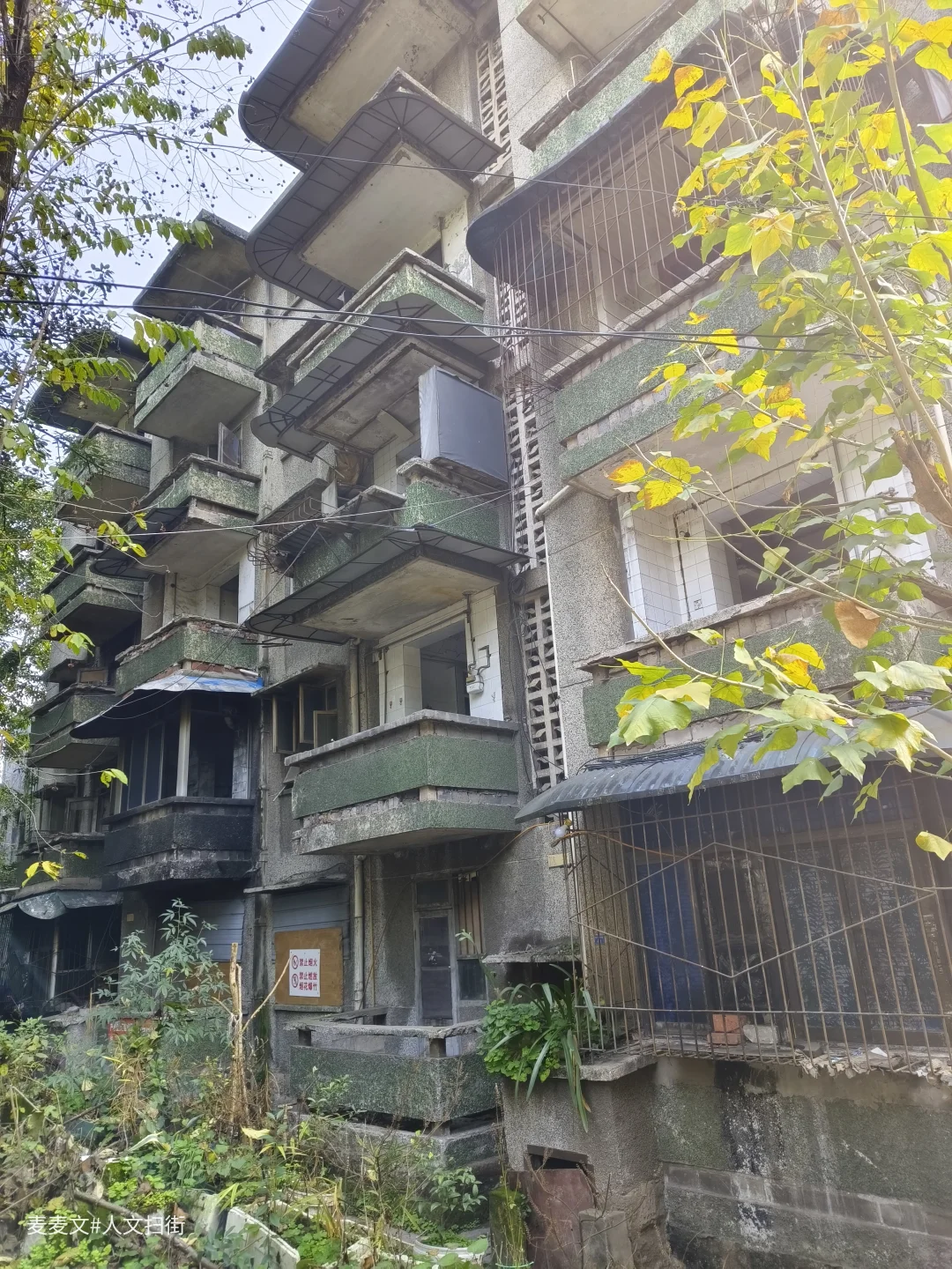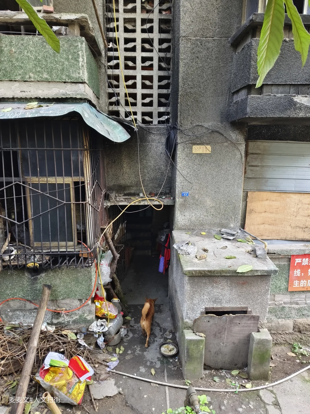 蔡家横街的蓝底老门牌还钉在斑驳的砖墙上,像一枚被遗忘的邮戳。青瓦屋檐塌了半边,木门上的“福满人间”红联褪成了淡粉,院坝里的黄狗独自穿过蛛网与杂物,脚步声在空荡的巷弄里格外清晰。 老家属楼当年流行的马赛克瓷砖的阳台爬满了藤蔓,窗棂的铁栅栏锈迹斑斑,楼下的菜地还种着青菜,却再也等不到主人的身影。被车衣覆盖的轿车、歪斜的木梁、墙上“危房危险”的告示,都在诉说着人去楼空的故事。 这里曾是重庆北碚蔡家老街的烟火核心,如今只剩时光在砖瓦间缓慢流淌,把老场镇的记忆,封存在每一道裂缝里。