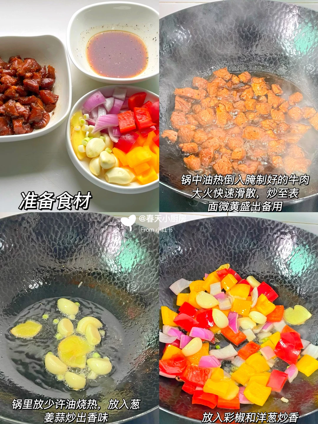 牛里脊肉300g、彩椒2个(红黄各一个)洋葱半个,蒜瓣4瓣、葱花、姜片