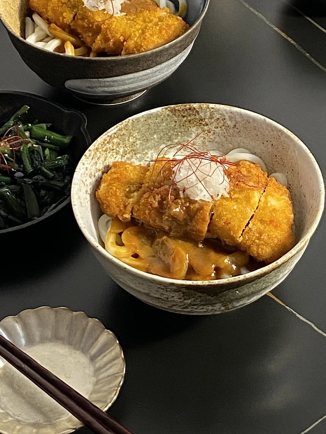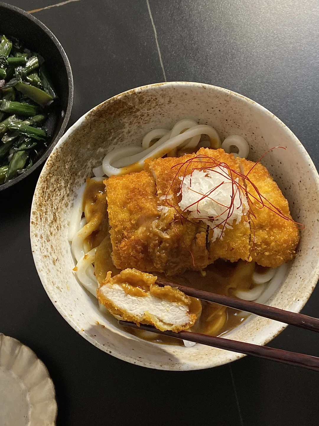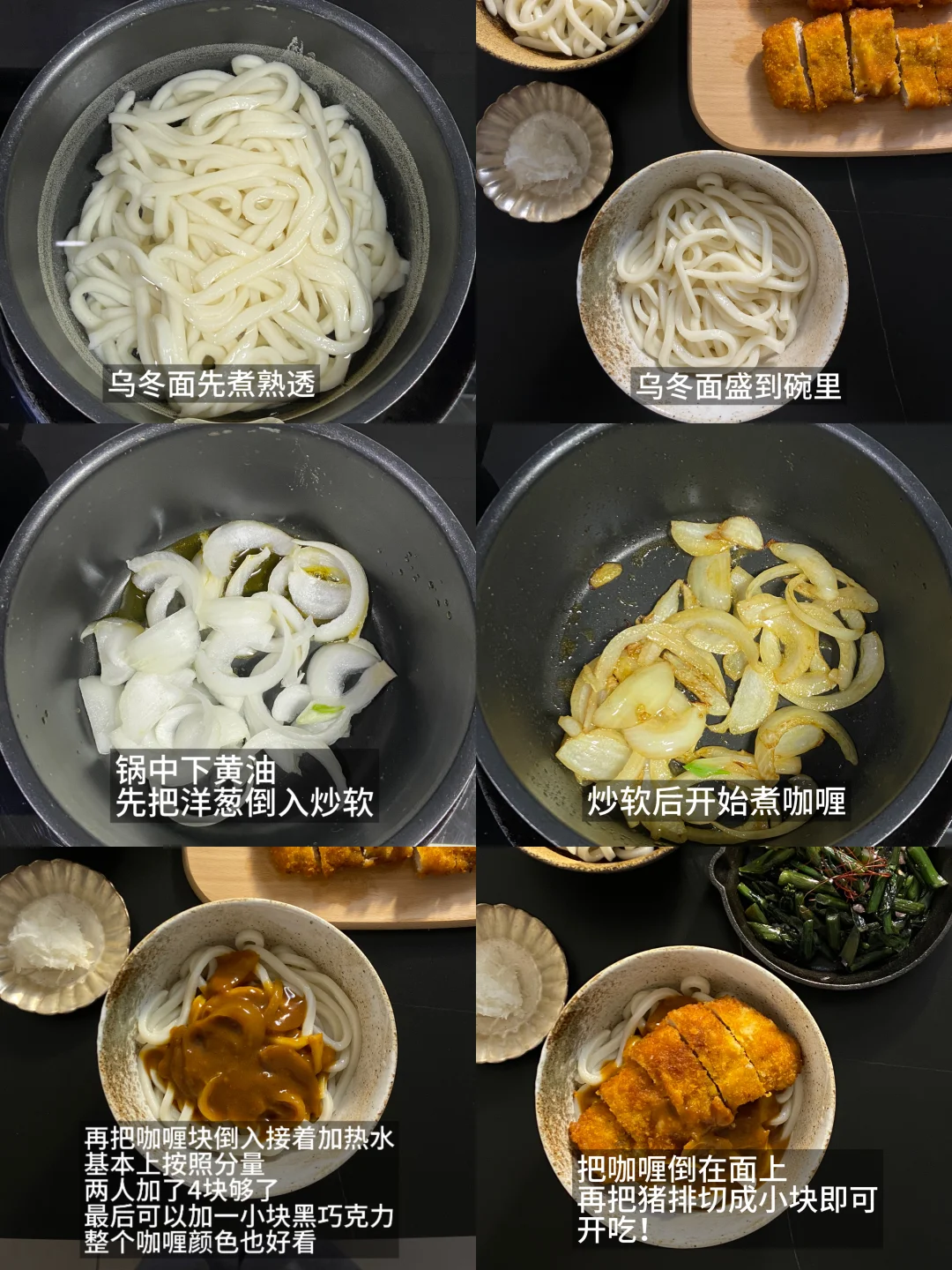 2)乌冬面煮熟透盛到碗里,加一勺咖喱,再铺上猪排,好吃!