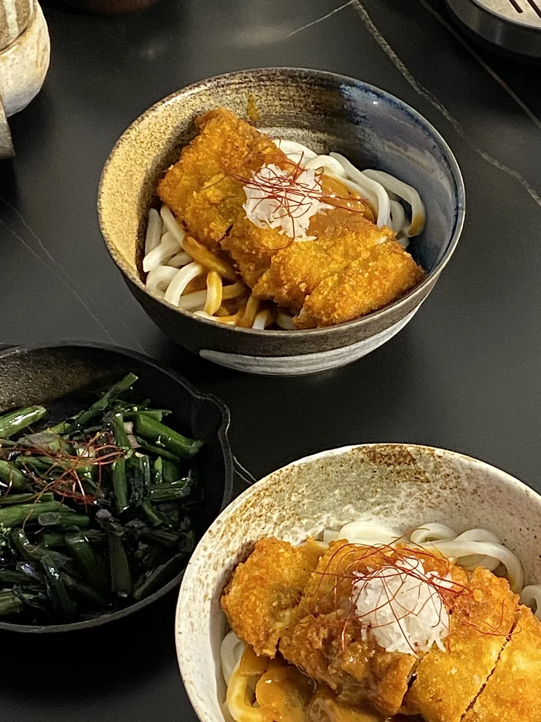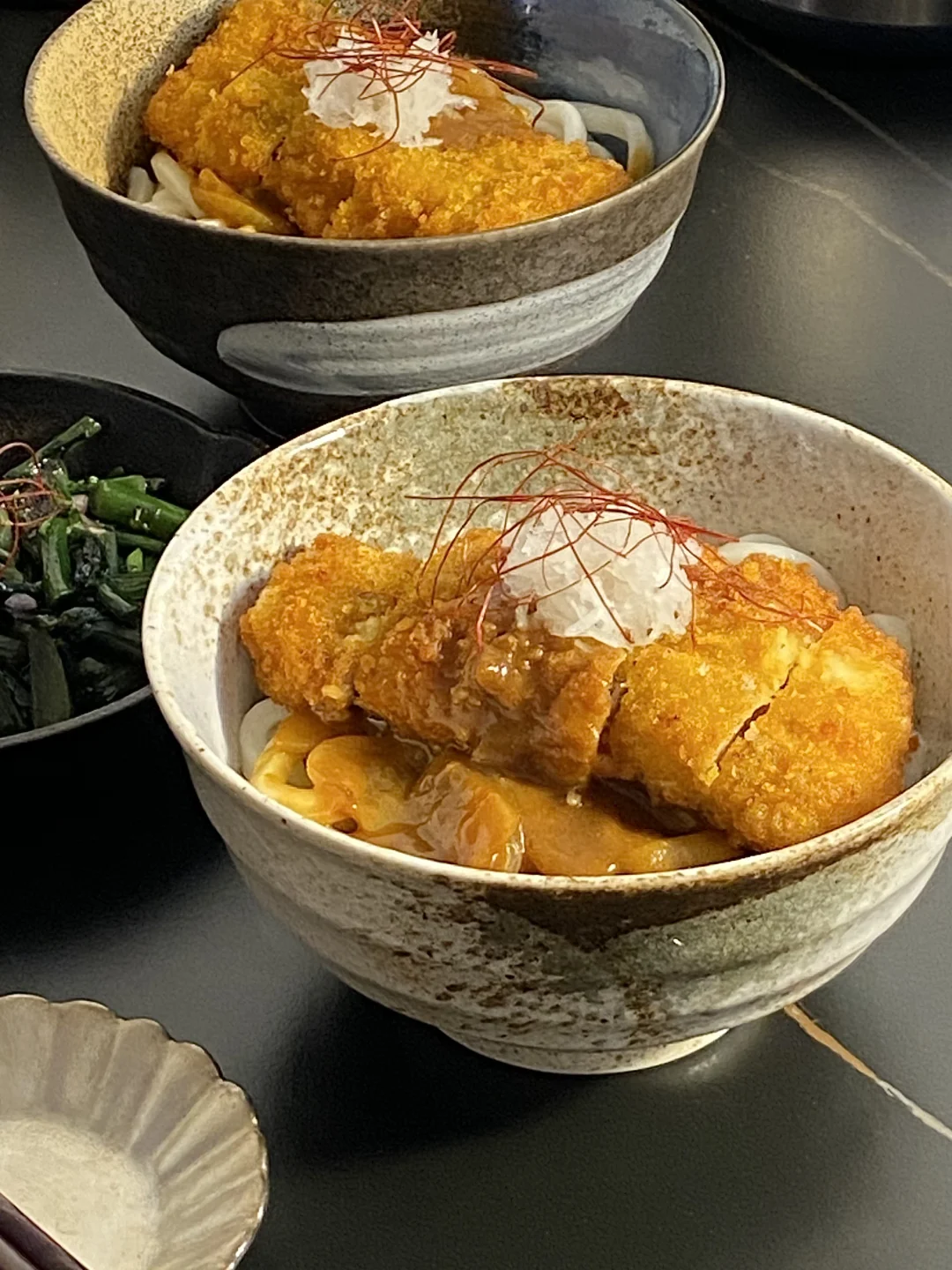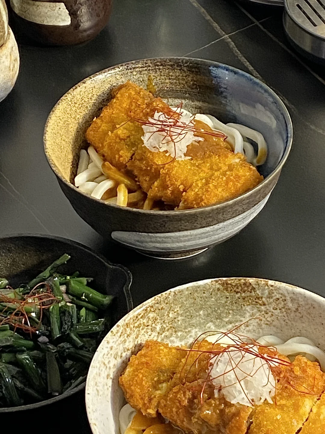 2)乌冬面煮熟透盛到碗里,加一勺咖喱,再铺上猪排,好吃!