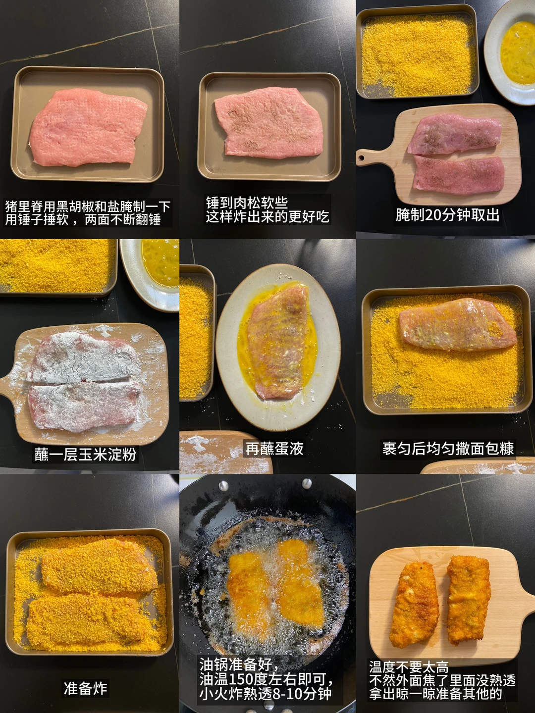 猪里脊|黑胡椒|盐|蛋液|淀粉|面包糠