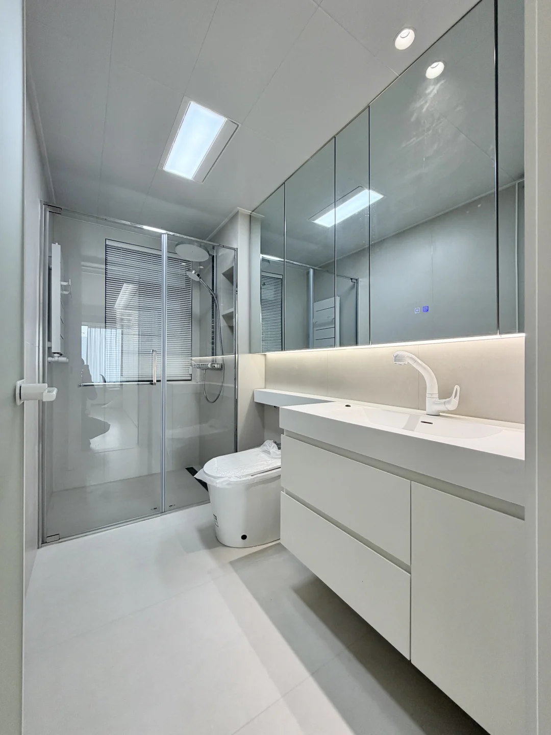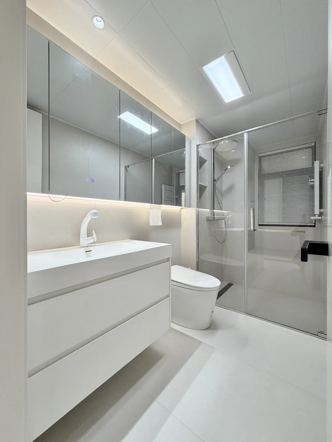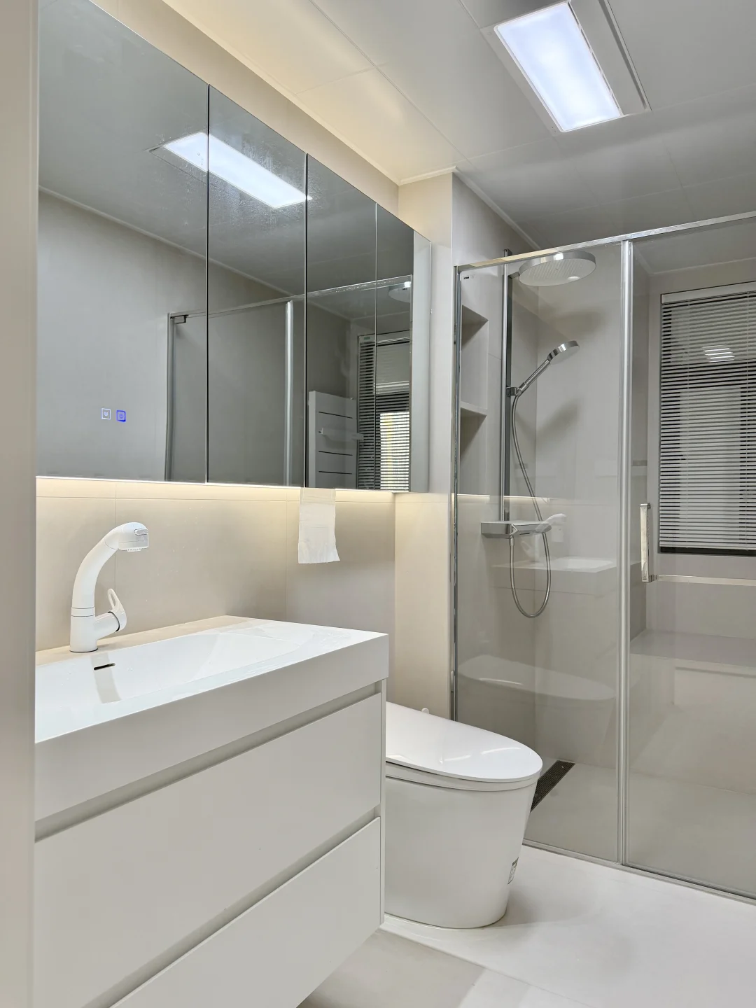 🏷墙地1.2米瓷砖通铺,显大又好打理 🏷铝扣板吊顶,省钱还不丢颜值 🏷满墙镜柜=颜值+收纳,太能装了 🏷不锈钢淋浴房,质感吊打传统黑框 🏷台面一体延伸,整体感直接拉满 小户型卫生间,这就是最优解✨