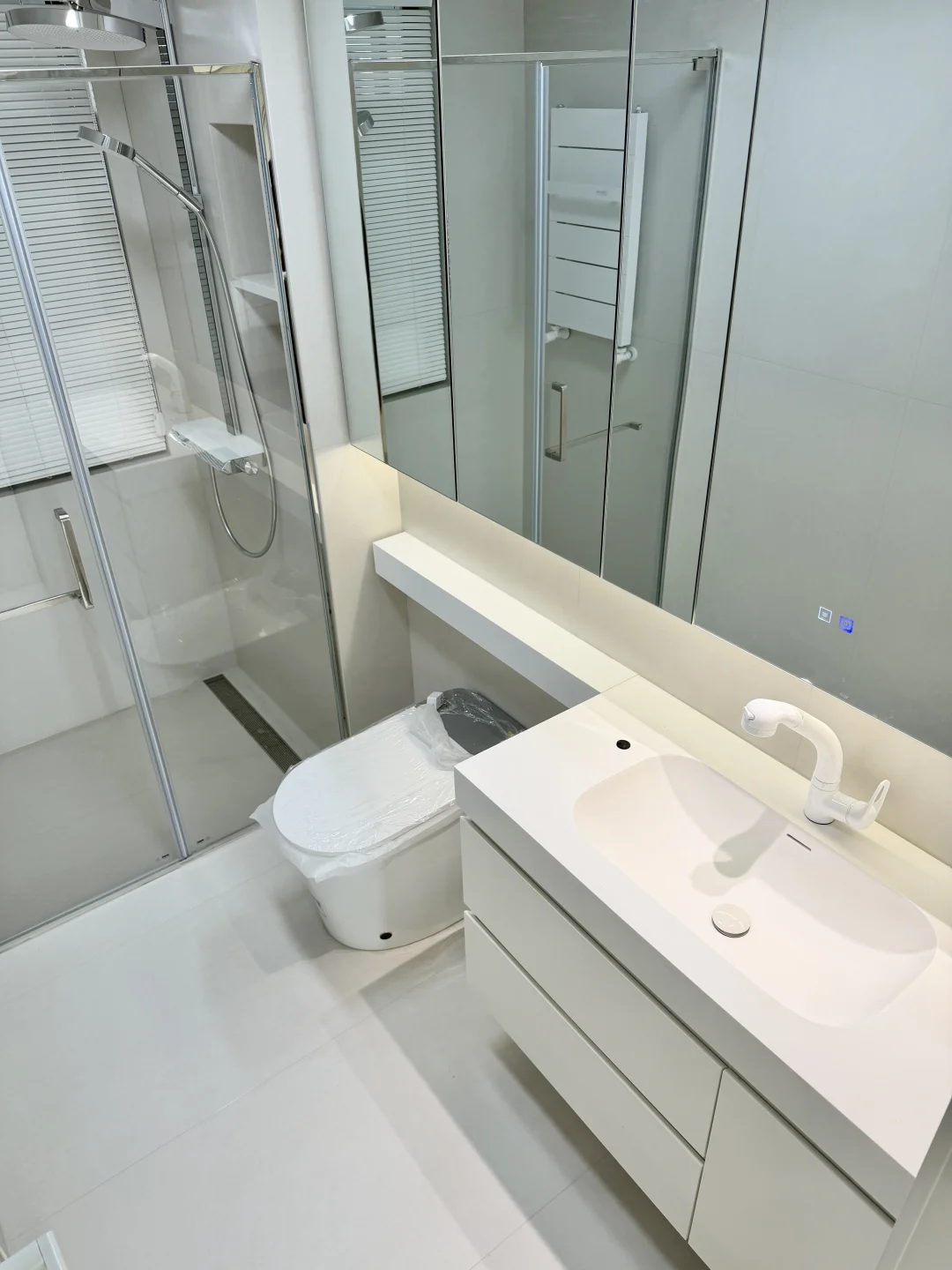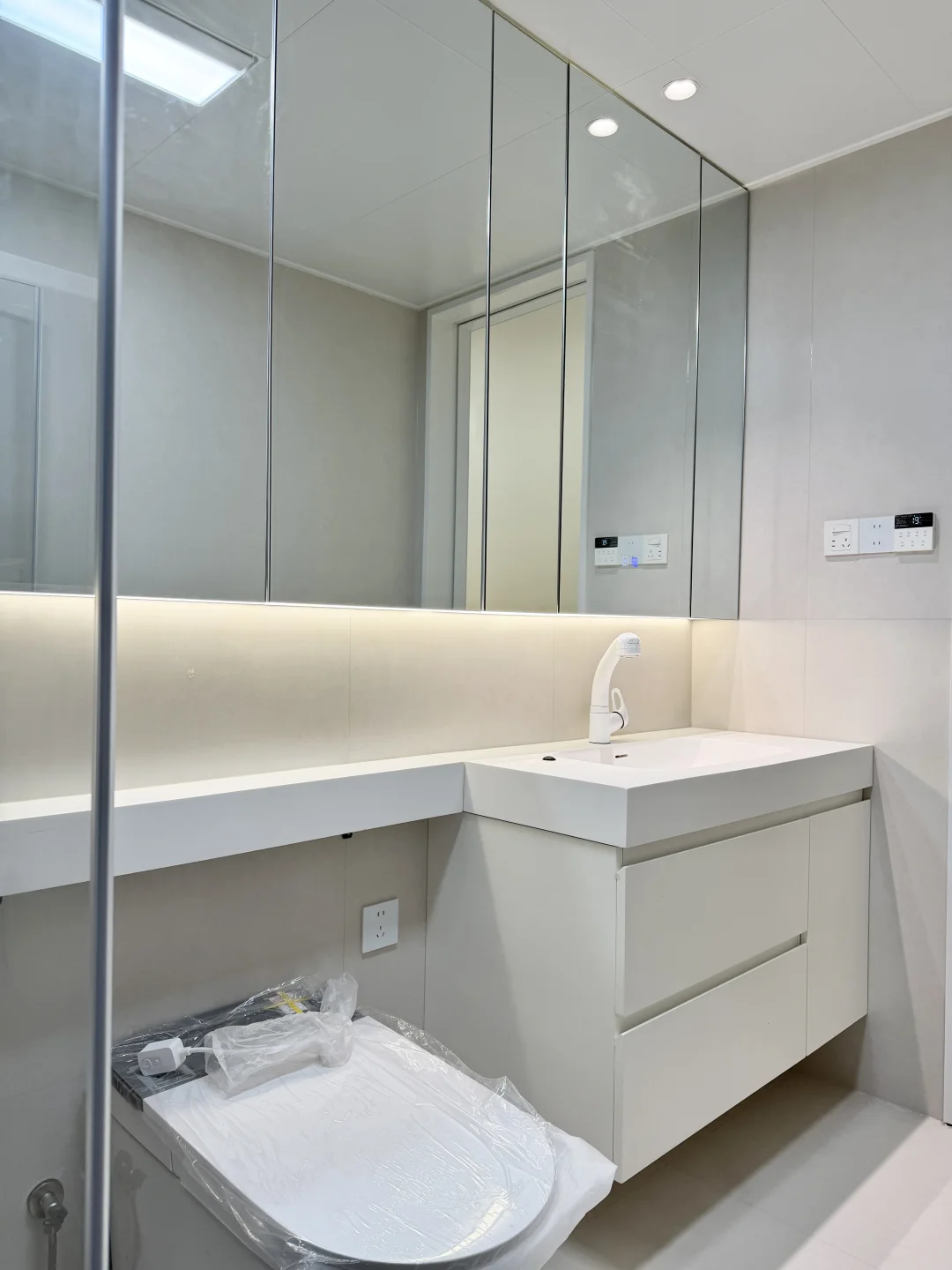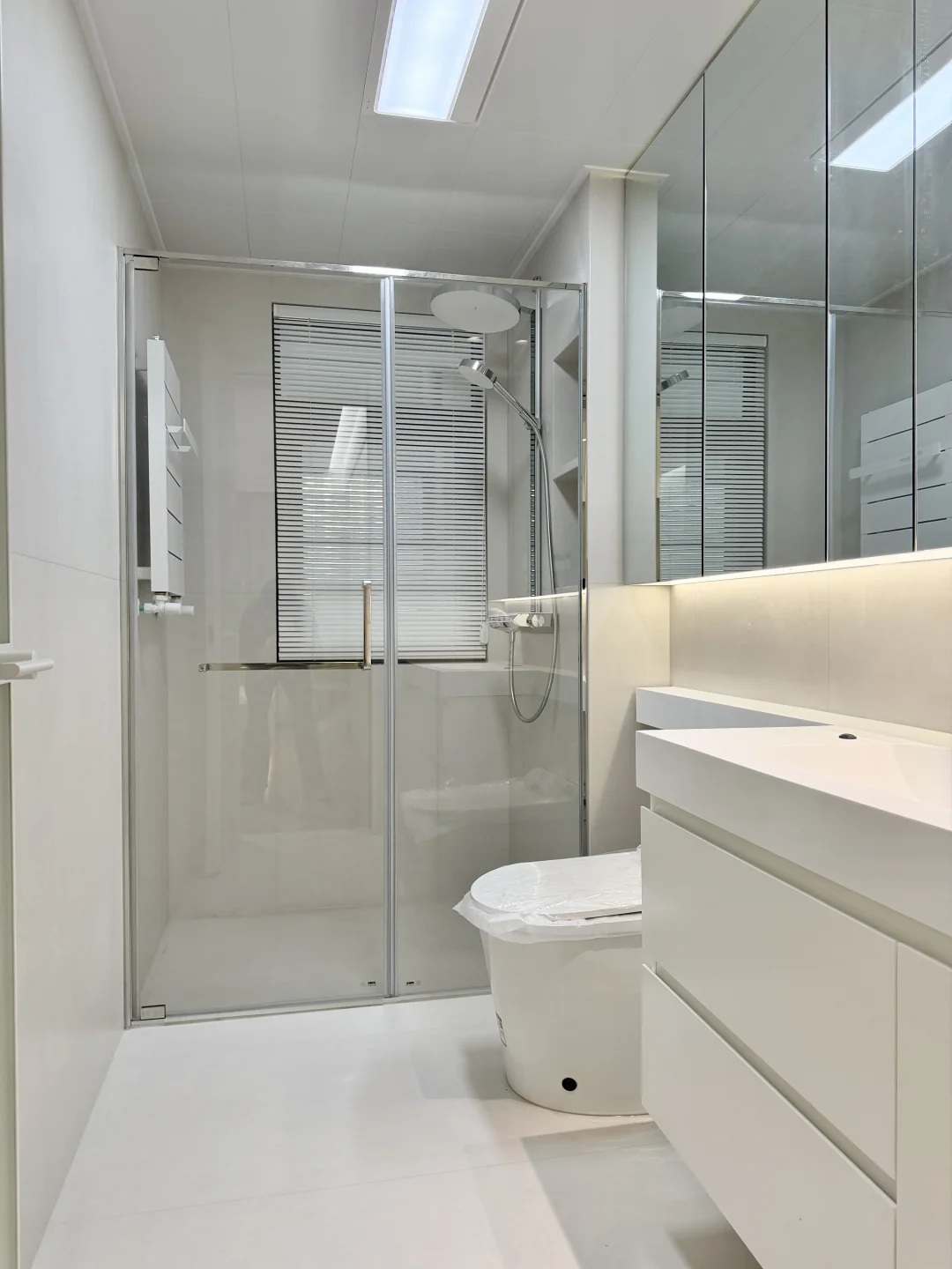 🏷墙地1.2米瓷砖通铺,显大又好打理 🏷铝扣板吊顶,省钱还不丢颜值 🏷满墙镜柜=颜值+收纳,太能装了 🏷不锈钢淋浴房,质感吊打传统黑框 🏷台面一体延伸,整体感直接拉满 小户型卫生间,这就是最优解✨