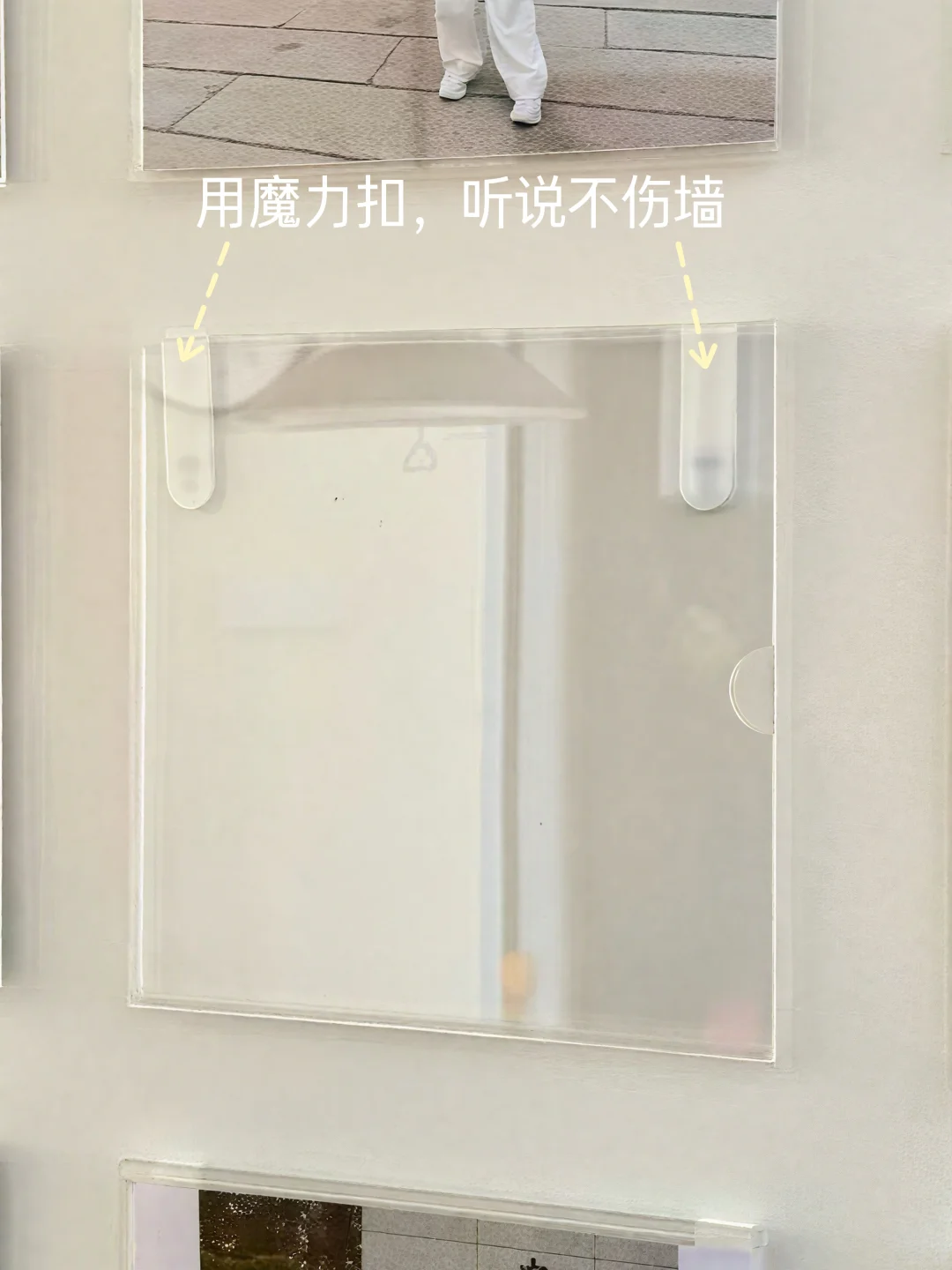 照片墙制作: 1️⃣亚克力板 方8寸(202mm*202mm) 双层 2️⃣照片打印 3️⃣魔力扣粘贴 两个相框之间间隔5cm,我先用美纹纸框出总框架,再对齐贴平