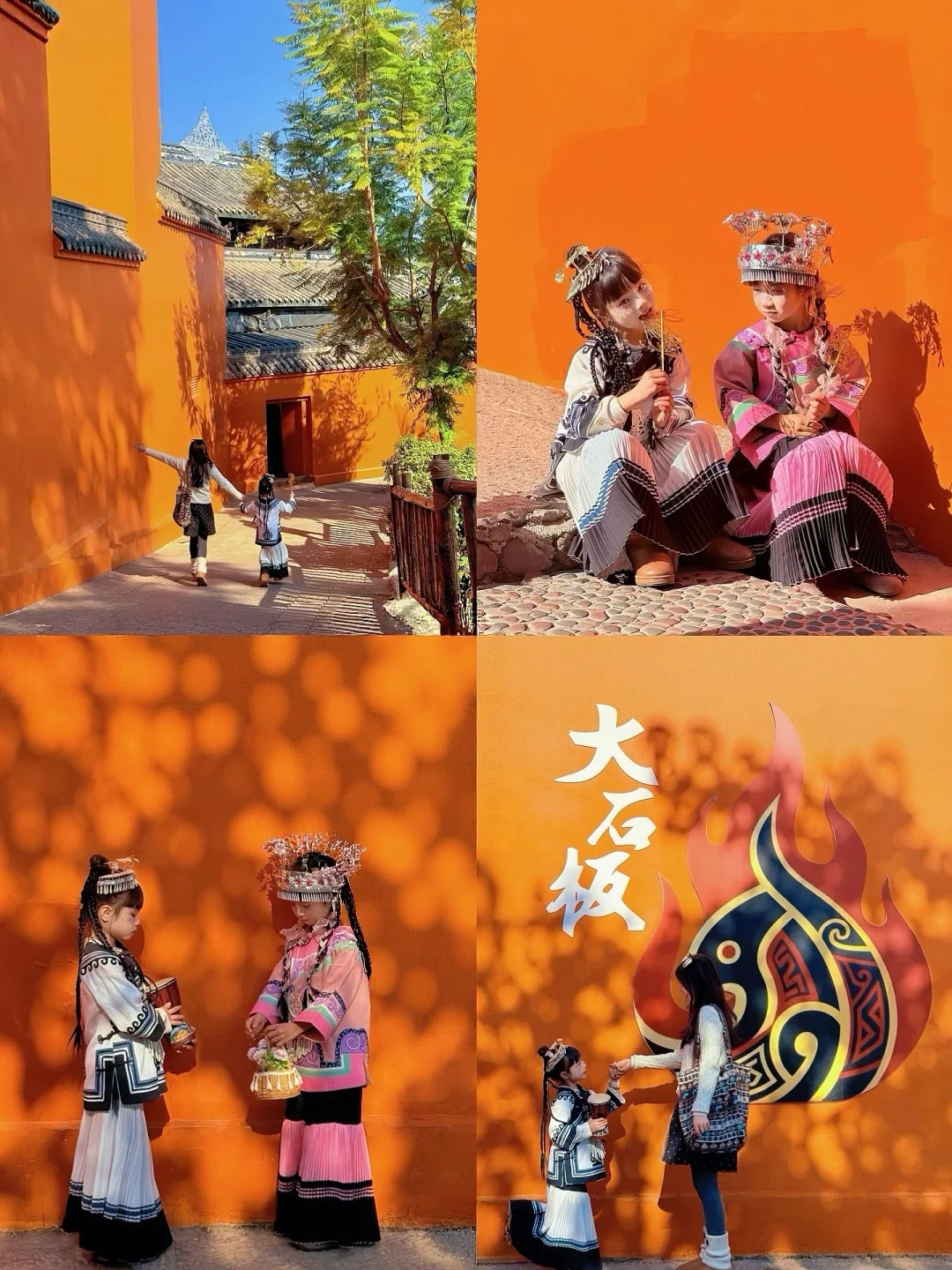 橙色的灵鹰寺墙面搭配蓝天,随手一拍都是大片,还可以给孩子租彝族服饰拍照