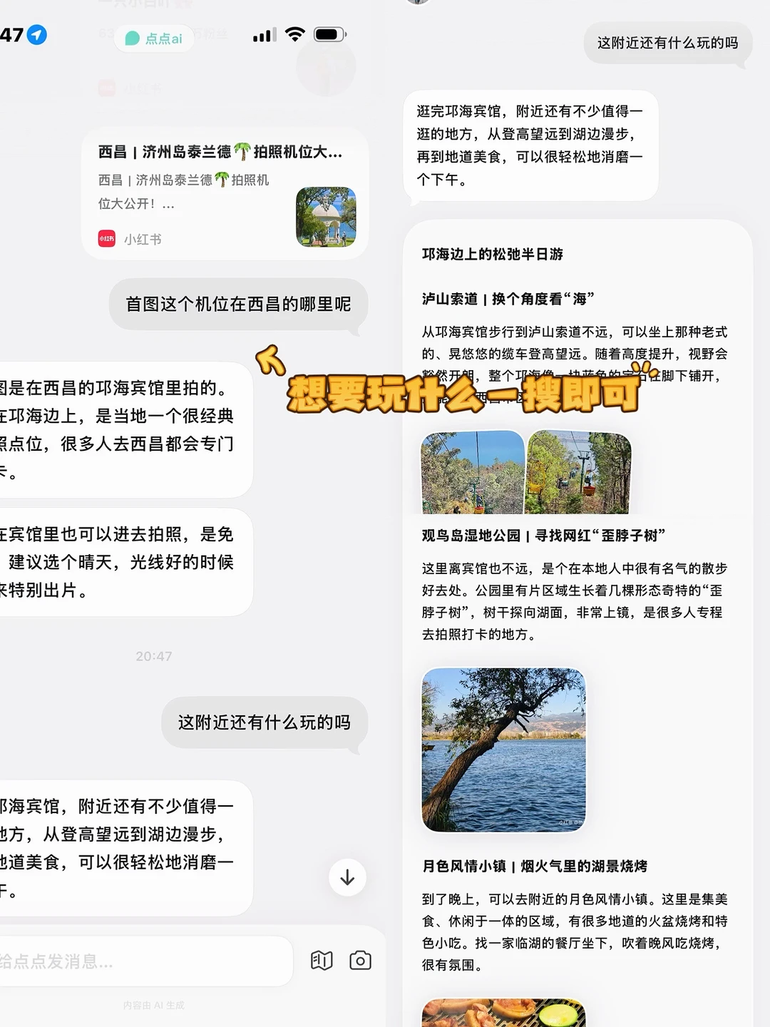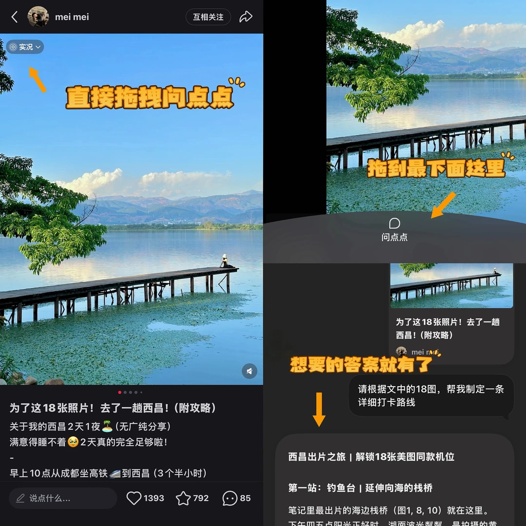 它就像个随身的旅游助手,不仅能整理出完整攻略,景点路线、美食推荐全都有,而且所有信息都来自真实笔记,比我自己熬夜翻那么多篇靠谱多了!