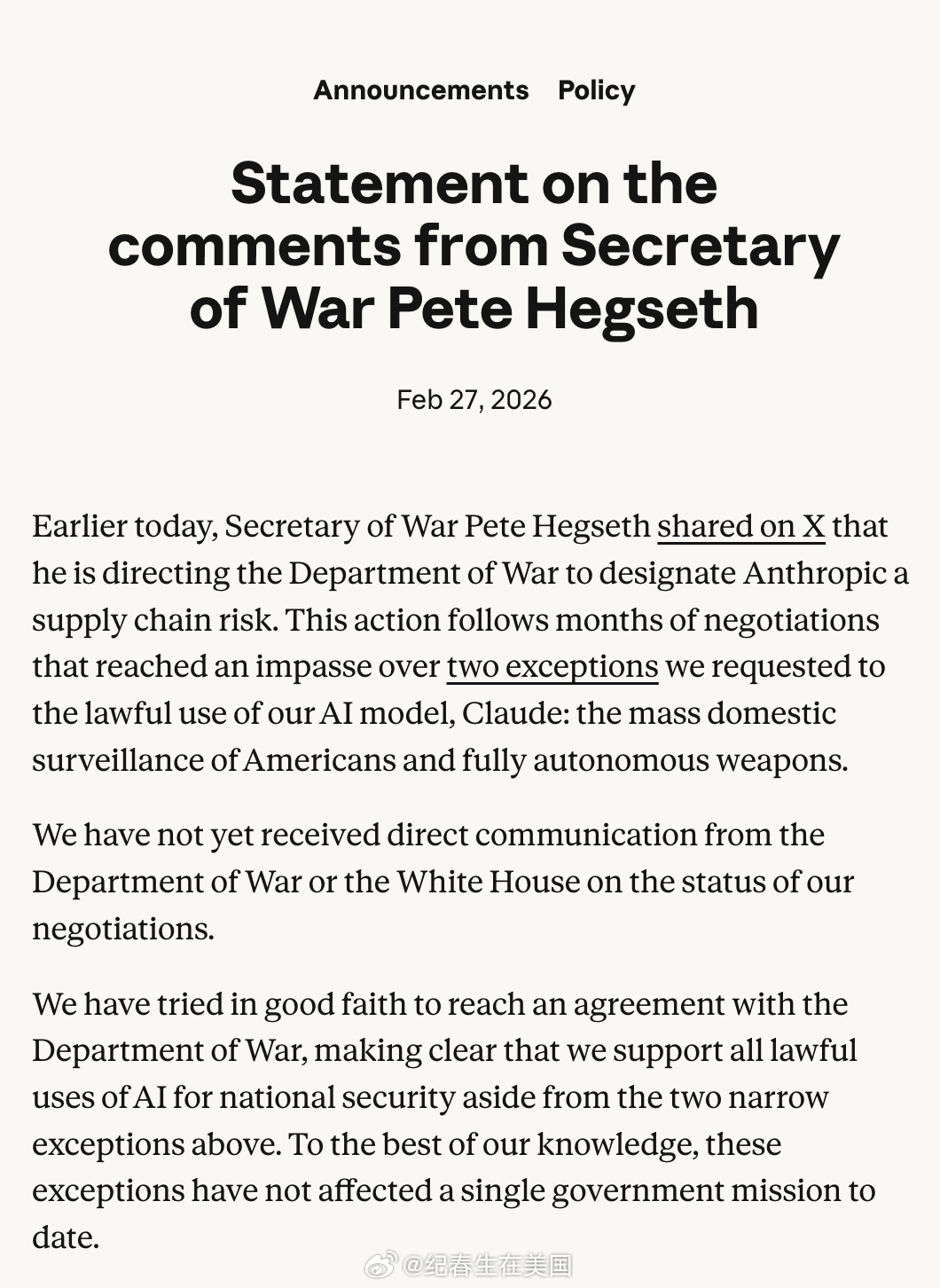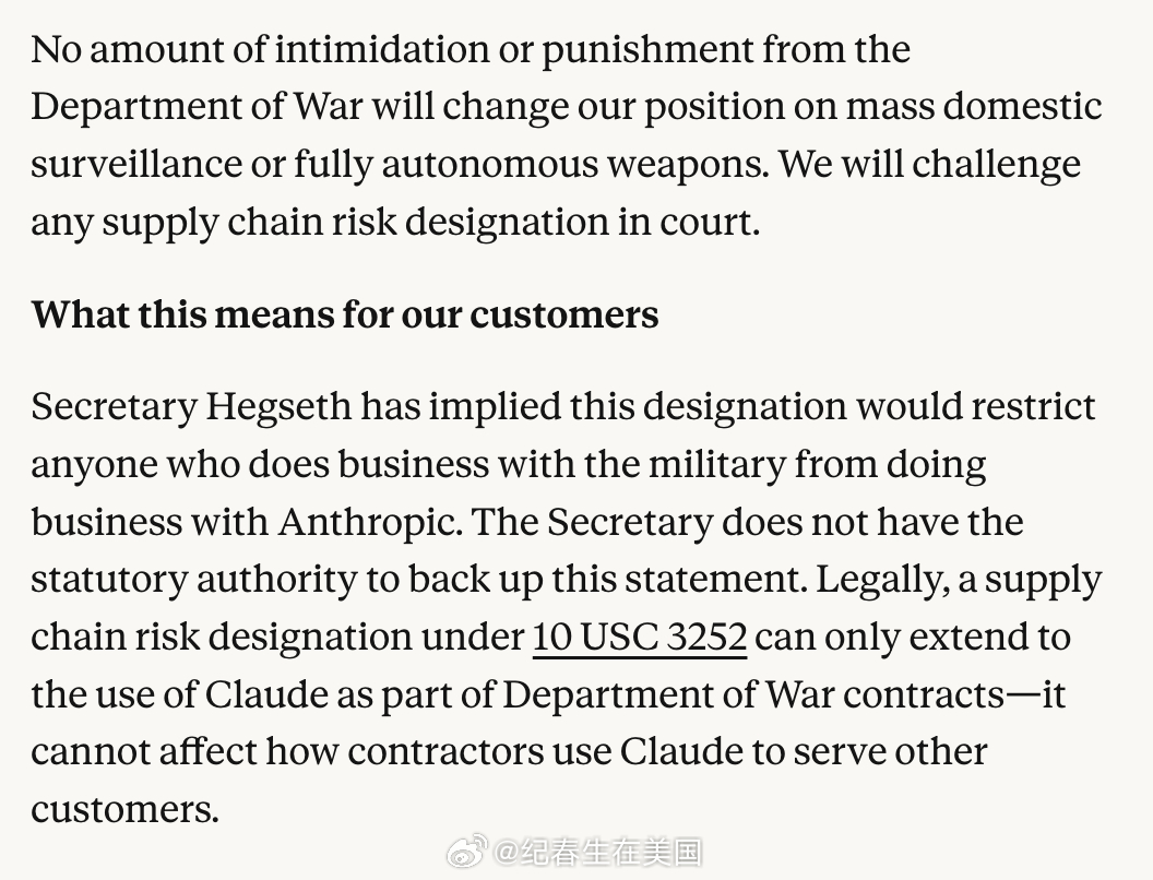 “今天早些时候,战争部长Pete Hegseth在 X 上发文称,他正指示战争部将 Anthropic 指定为“供应链风险”。这一行动是在与战争部进行了数月谈判之后采取的;谈判因我们就 Claude(我们的 AI 模型)的合法使用提出的两项例外请求而陷入僵局:对美国人进行大规模国内监控,以及完全自主武器。
