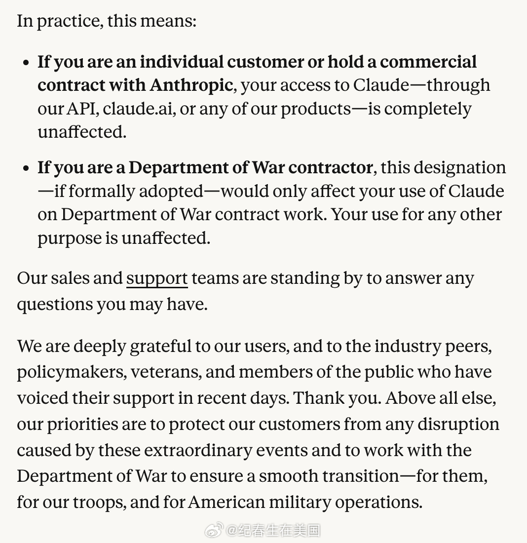我们由衷感谢我们的用户,以及业内同仁、政策制定者、退伍军人和近日公开表达支持的公众成员。谢谢。最重要的是,我们的优先事项是保护客户,避免这些非同寻常事件造成任何中断,并与战争部合作,确保顺利过渡——为了他们、为了我们的部队,也为了美国的军事行动。”