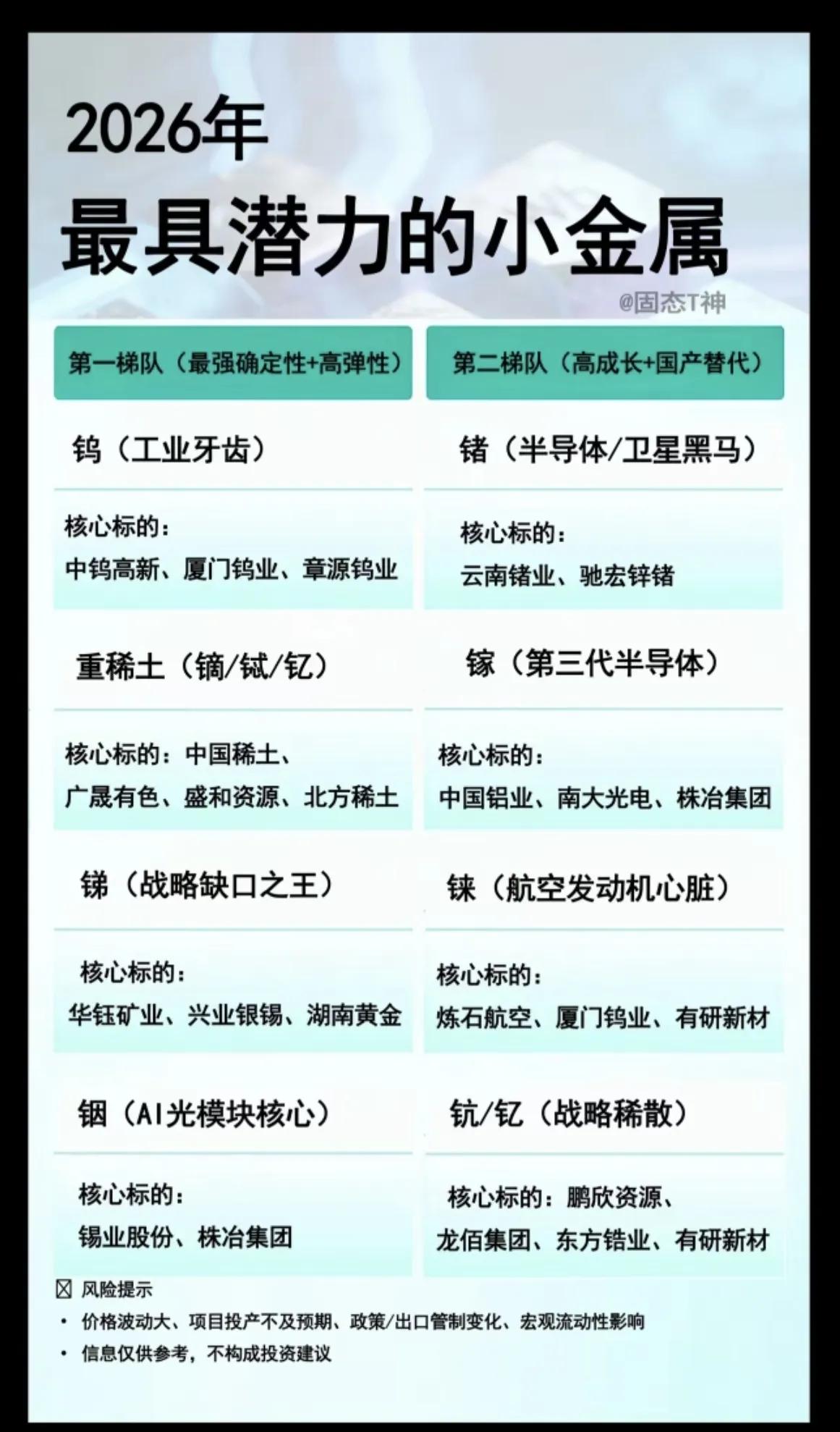 2026年最具潜力小金属板块!!! 去年,贵金属板块开始一轮上涨行情,小金属板块也隐藏着很多潜力股,比如钨粉 ,工业用途广泛,后市值得重点关注;金属镓,广泛用于半导体行业,是半导体重要的生产原料,后市值得期待!!!