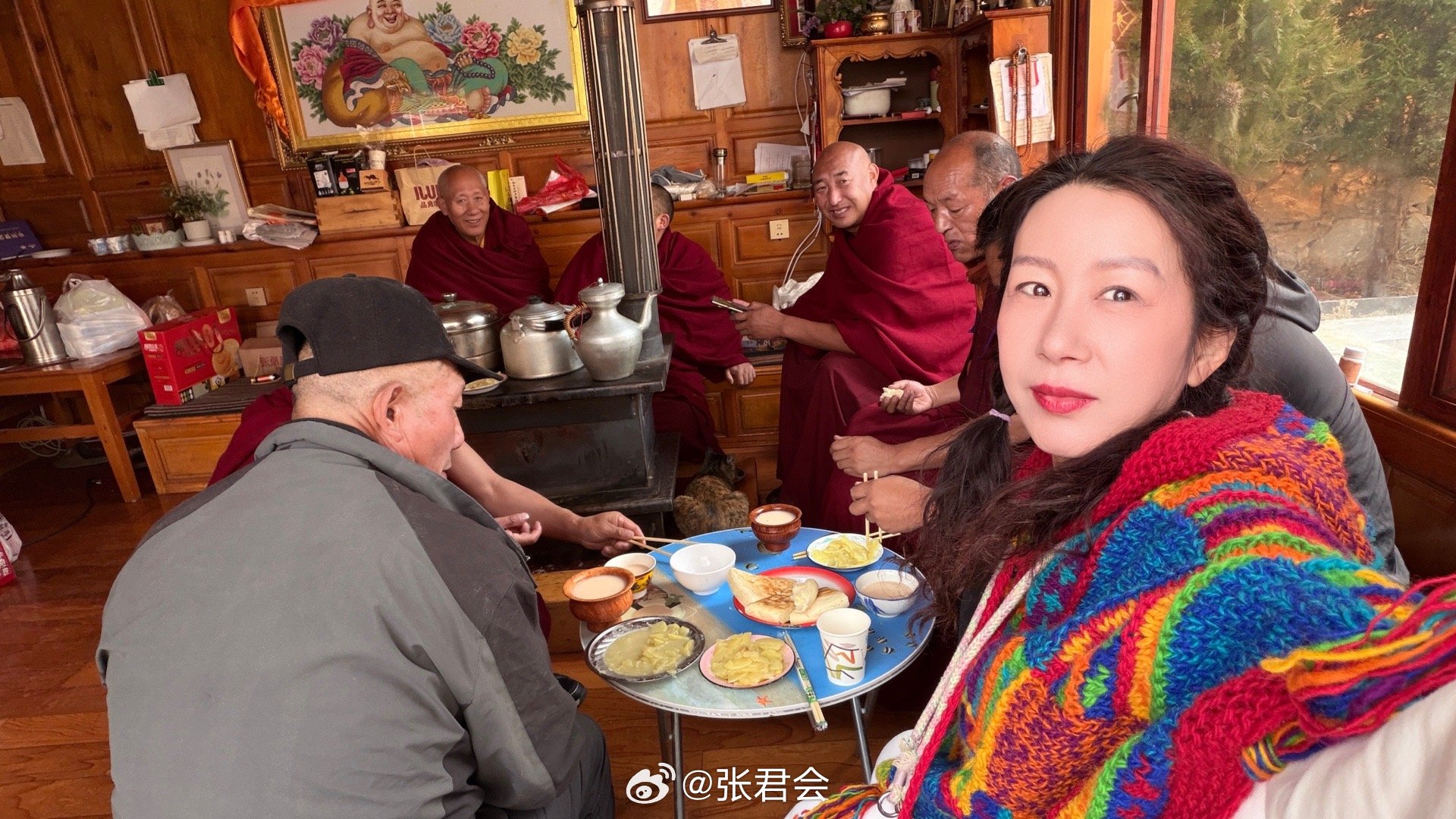 今天的午餐蹭的有点厚颜无耻,本来跟着松赞旅行管家格桑看壁画,正赶上寺里的大康赞和管家午休吃饭议事,就,跟着酥油茶青稞饼加土豆片的大吃一餐。。。咱也听不懂人家在商量啥,就看到大管家给了二管家一沓子钱,然后小管家就嘟嘟囔囔出门去了。。。。修行日常分享佛教川西旅行 香格里拉·噶丹松赞林寺