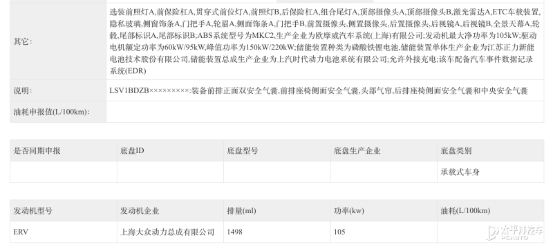 动力方面,根据此前公布的工信部申报信息可知,ID.ERA9X搭载了型号为ERV的1.5T发动机作为增程器,最大功率为105kW。电池方面,新车配备了宁德时代的65.2kWh大容量电池组,CLTC工况下纯电续航超过400公里,足够的纯电续航里程意味着日常通勤基本可以完全依赖电力。