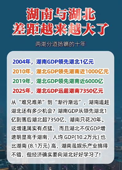 湖南与湖北的GDP差距,核心就是长沙与武汉的差距! 以2025年GDP数据为例 湖北全省:6.27万亿元, 湖南全省:5.53万亿元, 两省差距:约7350亿元; 武汉:2.21万亿元, 长沙:1.57万亿元 两市差距:约6400亿元。 两省之间差距的87%,来自长沙与武汉的差距。 为什么武汉领先这么多? 1. 城市能级与定位 武汉:国家中心城市、中部龙头、全国前十,占湖北GDP约35% 长沙:区域中心、长株潭核心,占湖南GDP约28% 2. 产业结构与集群 武汉:光芯屏端网、汽车、大健康三大万亿集群,数字经济超1.1万亿 , 长沙:工程机械、文创、食品加工为主,新兴产业集群规模偏小。 3. 科创与人才 武汉:武大、华科领衔,高校/科研院所密集,光谷GDP超3200亿。 长沙:科教实力偏弱,高端人才与创新平台差距明显。 4. 交通与枢纽 武汉:九省通衢、长江黄金水道、中欧班列枢纽,物流成本更低, 长沙:交通枢纽地位弱于武汉,对外辐射与物流效率偏低。 三、两省其他差距(次要) 湖北副中心更强:襄阳、宜昌均超6000亿,形成“一主两副”, 湖南更均衡:长株潭协同,但缺少第二增长极, 湖北增速更快:2025年湖北5.5%,湖南4.8%,差距在扩大。 总结来说: 湖南与湖北的GDP差距,主要就是长沙与武汉的差距。武汉凭借更高能级、更强产业集群、更优科创与交通,形成了对长沙的绝对领先,进而带动全省领先。