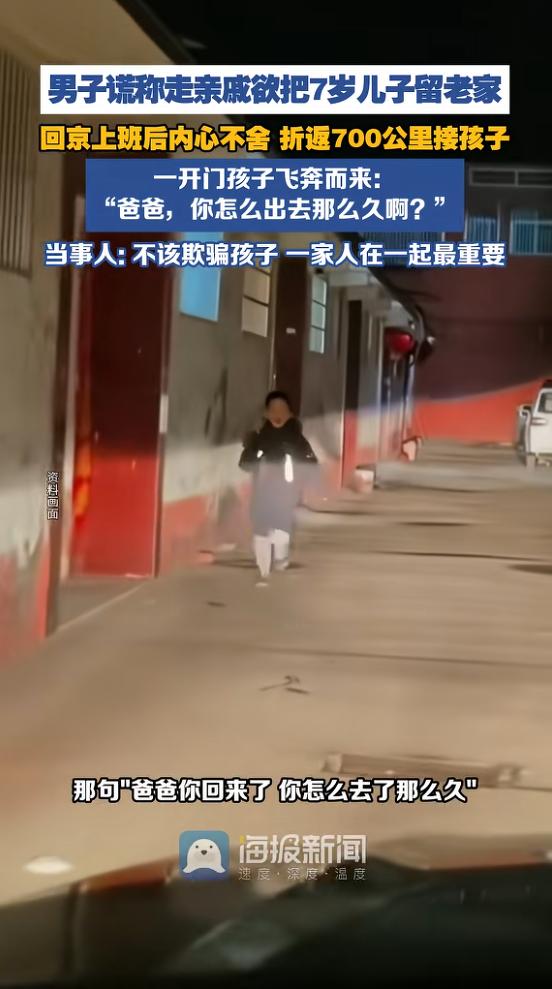 山东一父亲向儿子谎称走亲戚,独自开车返京上班,被上万网友留言触动,折返700公里接娃,孩子狂奔过来:“你没回来,我在你被窝里睡的” 事情发生在山东单县。 春节过后,母先生因为工作调动,需要回北京上班。 工作节奏一下子变得紧张,出差和加班都排得很满,他担心自己顾不上七岁的儿子。 一家人商量许久,打算把孩子暂时留在老家一年,让亲人帮忙照看,等工作稳定再接回身边。 真正要开口时,他却迟迟说不出口。 七岁的孩子正是黏人的年纪,如果直接告诉他要分开一年,大概会哭闹不止。 临出发那天,他蹲下来摸了摸孩子的头,说自己要去走个亲戚,很快就回来。 孩子没有多想,还站在车旁挥手,叮嘱他早点回来。 车子开出村口,他没有再回头多看。 十个小时车程,他脑子里反复闪过孩子挥手的画面。 到北京时已经是晚上,出租屋里安静得厉害。 没有孩子的说笑声,房间显得格外空。 他翻出白天告别时拍下的视频,随手发到网上。 评论区很快涌入大量留言。 不少人讲起自己的经历,说小时候被父母用类似的方式留在老家,一等就是一年。 有人说,那种被丢下的感觉持续了很多年。 还有人提到,长大后和父母之间始终隔着一层。 他盯着屏幕看了很久。 原本以为是权宜之计的善意谎言,忽然变得沉重起来。 那一晚,他几乎没有合眼。 第二天天还没亮,他给单位请了假,简单收拾后再次上路。 七百多公里的路程,他一口气往回赶。 服务区只停了一次,匆匆吃了几口饭,又继续开车。 傍晚时分,他推开老家的门。 孩子听见动静,从屋里冲出来。 看到父亲站在门口,先愣了一下,随后扑过来抱住他。 孩子问他怎么去了那么久。 又兴奋地告诉他,昨晚自己跑到爸爸的被窝里睡了一觉。 这一句话,让他鼻子发酸。 他意识到,孩子其实并非什么都不懂。 大人之间的商量,离别时的语气变化,都会被敏感地捕捉到。 后来他对媒体说,孩子已经七岁,不想让他留下阴影。 只要条件允许,还是带在身边更安心。 来回一千四百多公里,有人觉得折腾。 也有人认为请假影响工作。 他没有多解释,只说一家人在一起更重要。 视频再次被转发后,引发不少讨论。 有网友提到,童年时期的陪伴感,会影响一个人对世界的信任。 也有人说,物质条件再好,也替代不了父母在身边的日常陪伴。 这件事没有复杂情节。 一个父亲在现实压力和亲情之间做了选择。 改变主意只用了一天时间。 孩子依旧每天上学放学,日子照常继续。 对这个家庭来说,那趟折返的路程,像是一次及时的修正。 生活的难题还在,工作也不会轻松。 不过至少,父子之间没有留下那一年漫长的空白。 信息来源:《男子欲把7岁儿子留老家,内心不舍又折返700公里接孩子》海报新闻