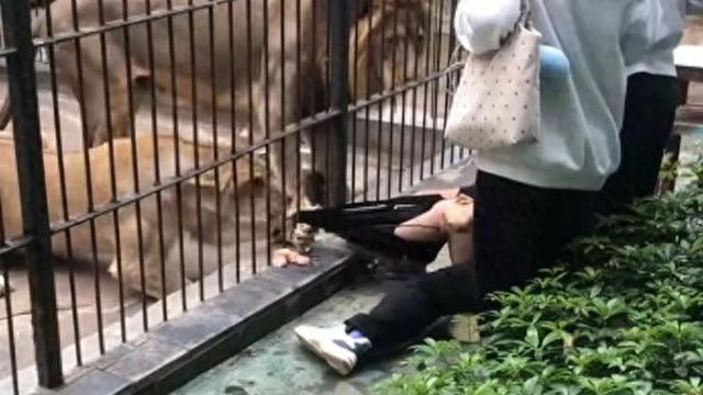 视频画面显示,在园区狮子展区外,一名身着紫色上衣的女孩贴近金属栅栏驻足疑似投喂时,铁笼内的母狮子突然伸出爪子,抓住了女孩的裤脚,将女孩拖倒。危急时刻,身旁一名男性陪同人员迅速反应,立即俯身将女孩护在身前,帮助其挣脱,及时将女孩拉离栅栏旁的危险区域。