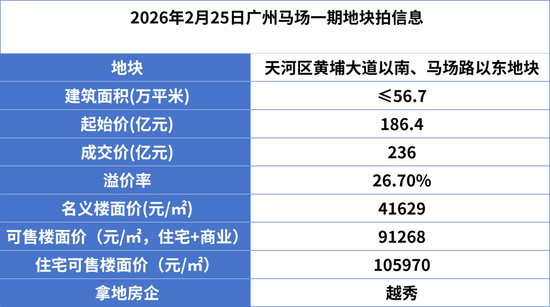 2026年2月25日,广州土地市场迎来“开年王炸”!越秀集团以236亿元总价、26.6%溢价率拿下天河马场地块一期,住宅楼面价高达8.57万元/㎡,一举刷新广州单价地王纪录。