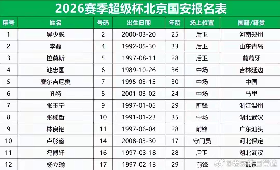 中超冬季转会窗关闭后,北京国安完成了冬窗引援工作,共引进8名新援,包括拉莫斯、恩科洛洛、孔特3名外援,以及茹子楠、邓捷夫、阿不都海米提、贾非凡、王禹5名内援。随后,国安公布了超级杯球员报名名单,有5名主力无缘名单,同时19岁小将将于下月离队。