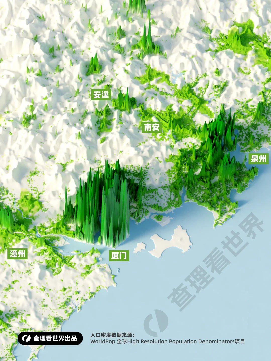 福建的地形像一道天然的屏障,西部和中部被武夷山脉、戴云山脉等群山占据,高达 90% 以上的土地是山地丘陵,这些区域在图中几乎是一片 “白色”,人口密度极低,只有零星的绿色点缀。而在东部沿海,从福州、莆田到泉州、厦门、漳州,一条狭长的沿海平原带却被密集的绿色覆盖,形成了一条耀眼的 “人口黄金海岸”。这里地势平坦、港口优良,是福建经济最发达、人口最集中的区域。厦门、泉州、福州的人口密度尤为突出,成为带动全省发展的核心引擎。
