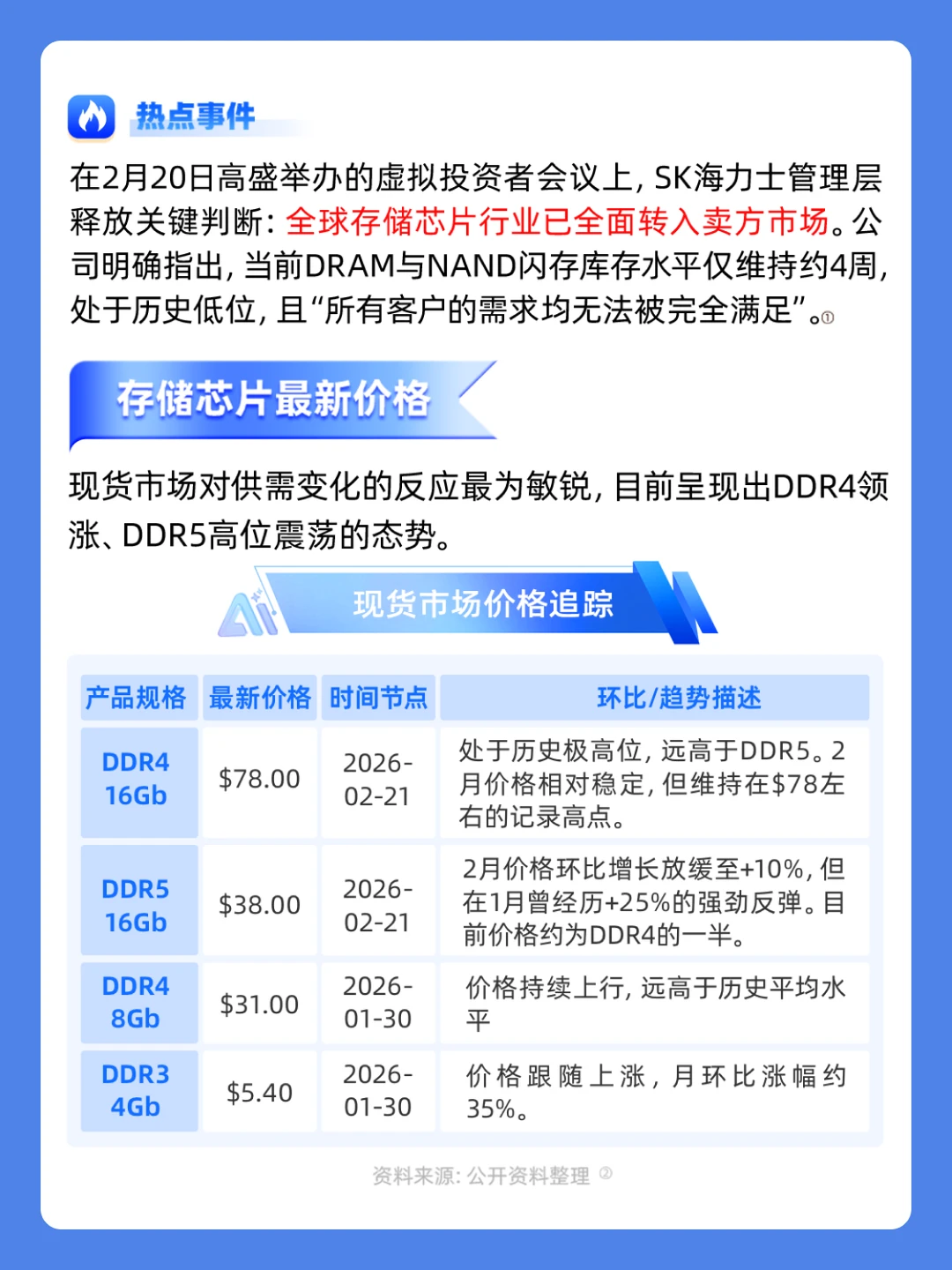 📅在2月20日高盛举办的虚拟投资者会议上, 💡SK海力士管理层释放关键判断: 🧑💻全球存储芯片行业已全面转入卖方市场。 ✨公司明确指出,当前DRAM与NAND闪存库存水平仅维持约4周, 🔥处于历史低位,且“所有客户的需求均无法被完全满足”。