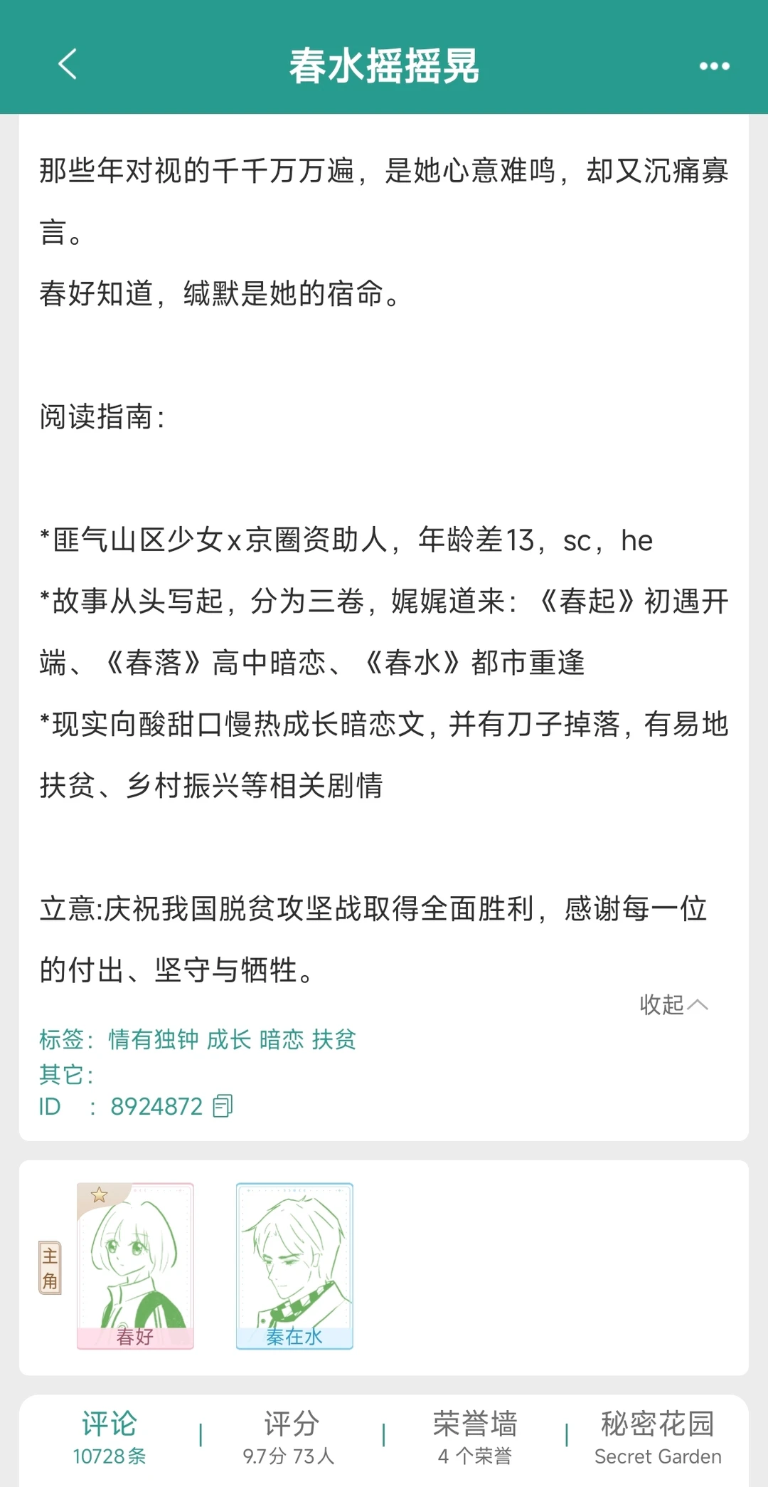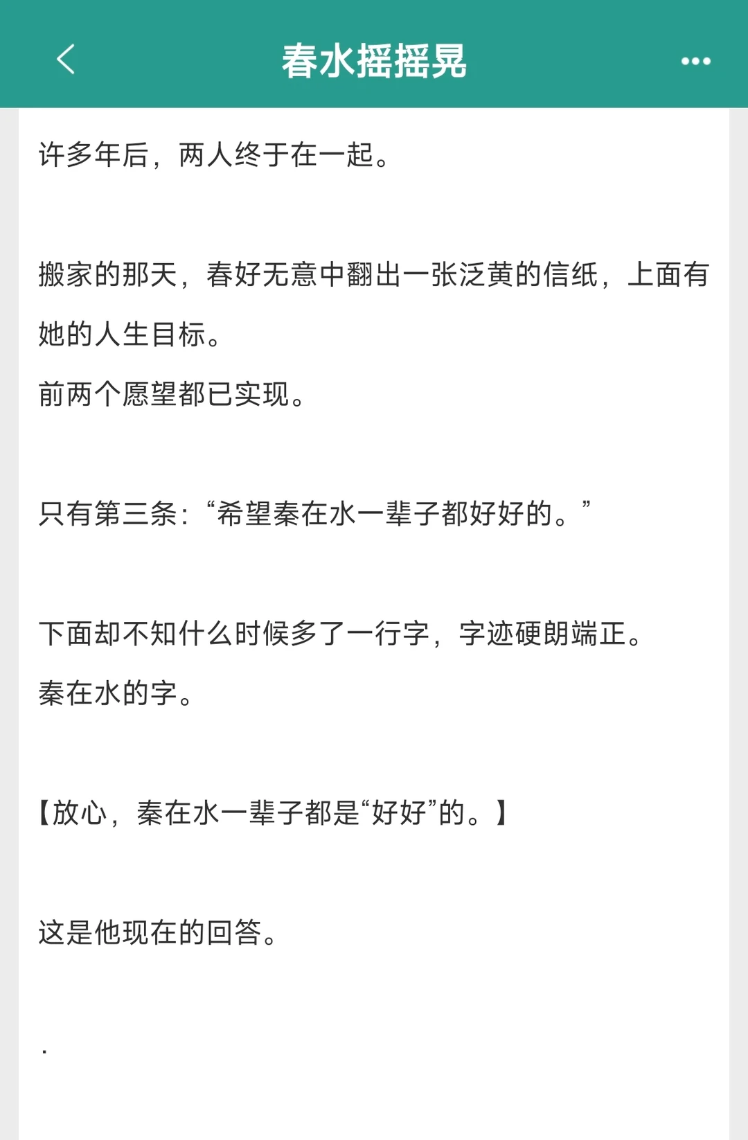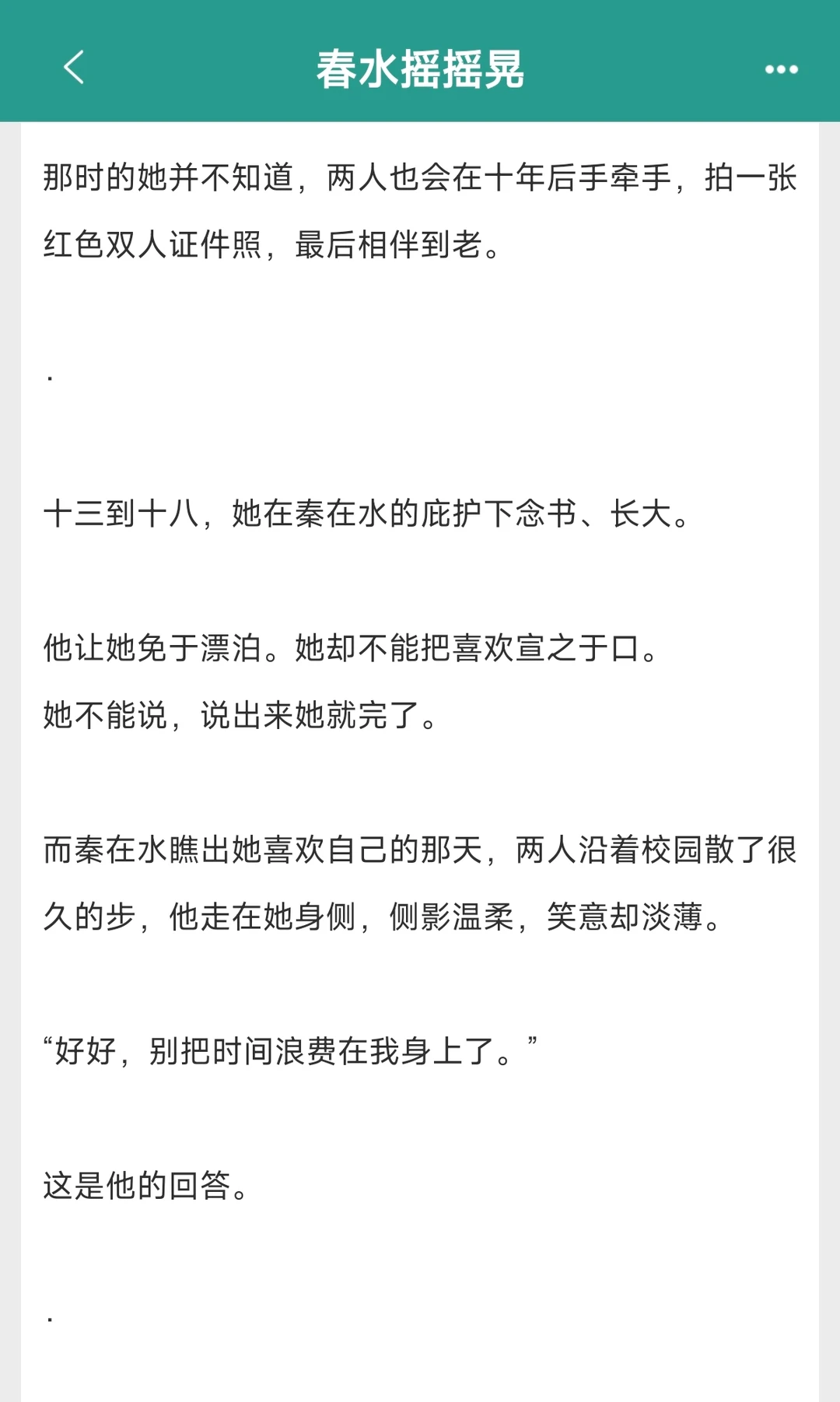 [仙女R]《春水摇摇晃》by羡山 [仙女R]字数约67万字 [仙女R]评分:9.7 [仙女R]推荐指数:[星R][星R][星R][星R][星R] [仙女R]人设:匪气坚韧少女 × 温柔克制京圈资助人 [仙女R]看点: 13岁年龄差、十年隐忍暗恋、极限拉扯、双向救赎 [仙女R]简介:十三岁那年,山里少女春好被清贵的资助人秦在水救下。 她是他怜悯的孤女,他是她不敢肖想的光。十年暗恋,她将心思藏得严严实实,直到他说:“好好,别把时间浪费在我身上了。” 后来他联姻,她平静出席他的婚礼。 再后来他因她受伤出国,她得知他假联姻……