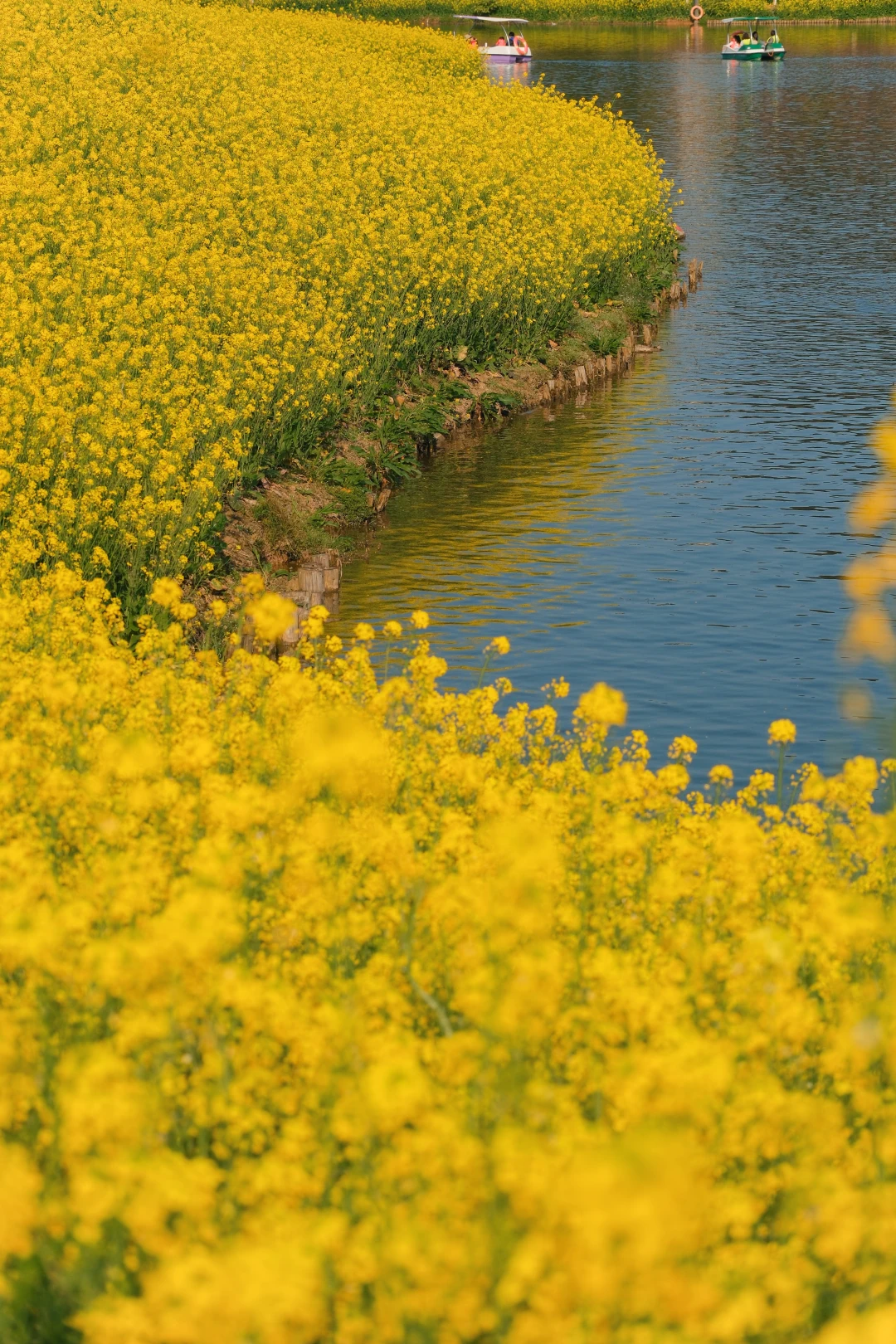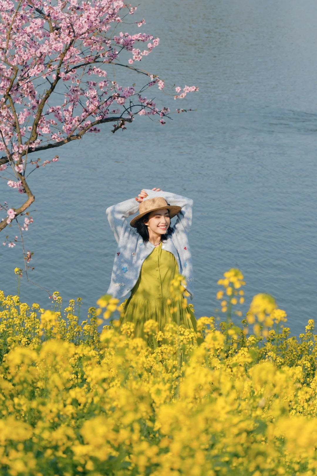 1️⃣找一棵离水边近一点的梅花树,然后模特走到靠近水边那条主路上,摄影师站到山坡上,从高处俯拍梅花、水面、油菜花的照片
