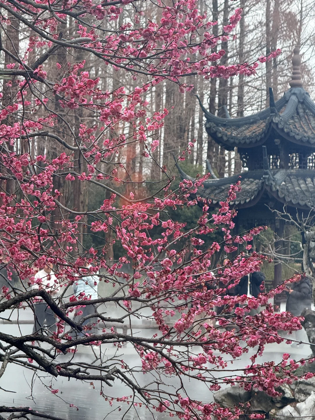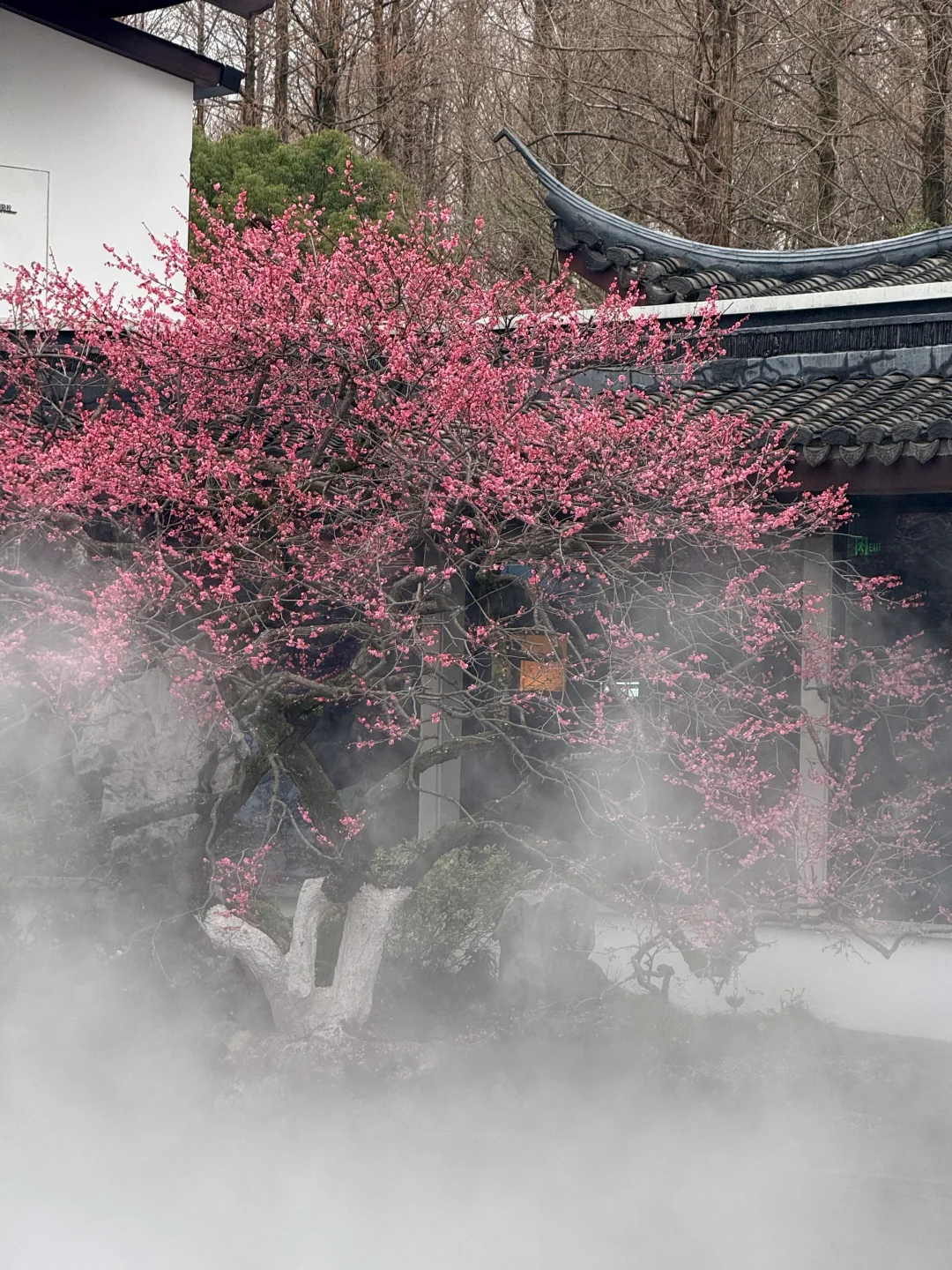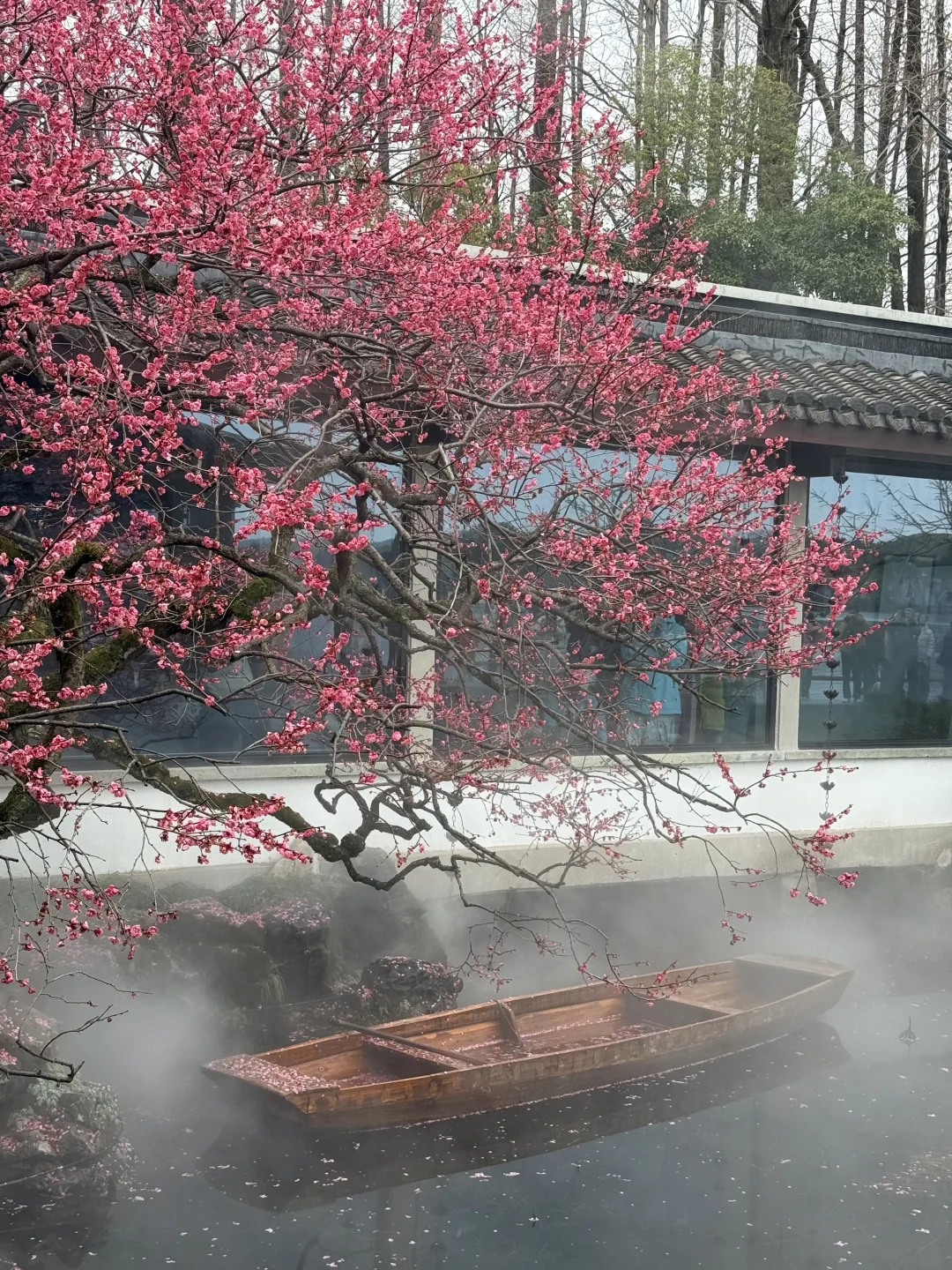 📍杭州西湖曲院风荷-湛碧楼 ☁️一直在喷雾,仙气飘飘的感觉 🌸梅花已经开始凋谢了,但整体还是很壮观的,游客也超多~ .