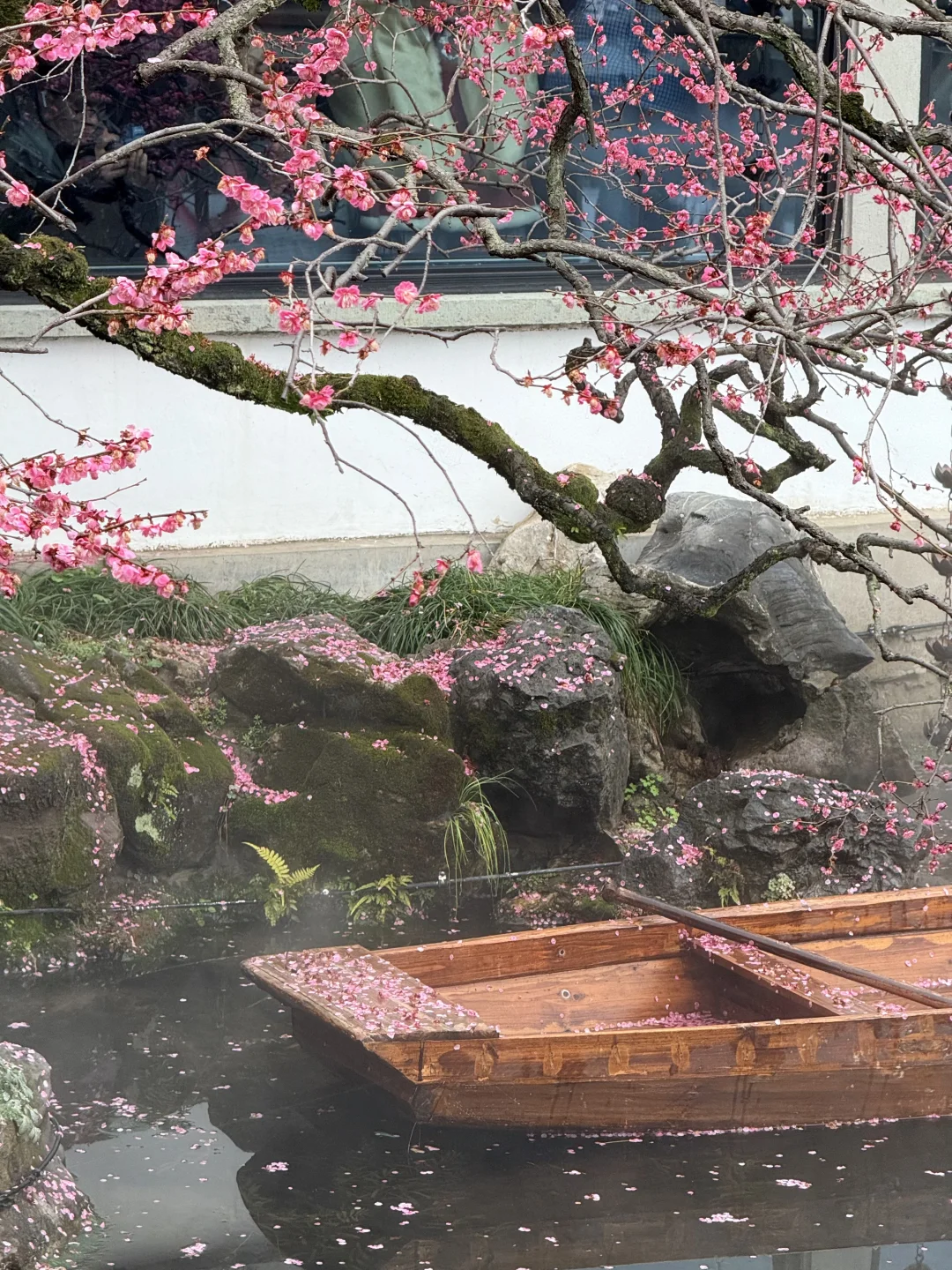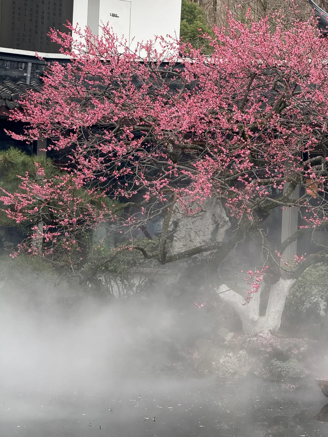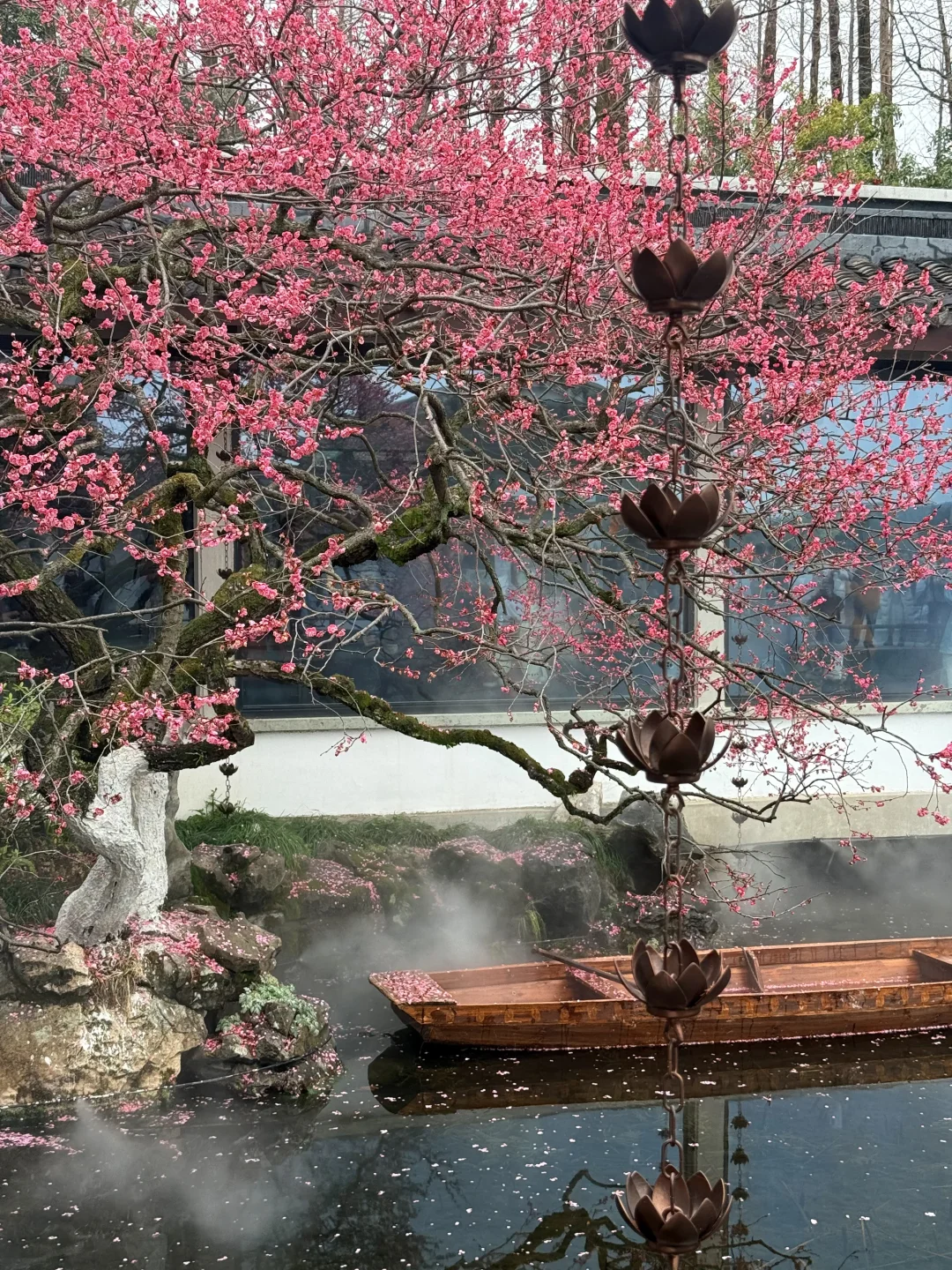 📍杭州西湖曲院风荷-湛碧楼 ☁️一直在喷雾,仙气飘飘的感觉 🌸梅花已经开始凋谢了,但整体还是很壮观的,游客也超多~ .