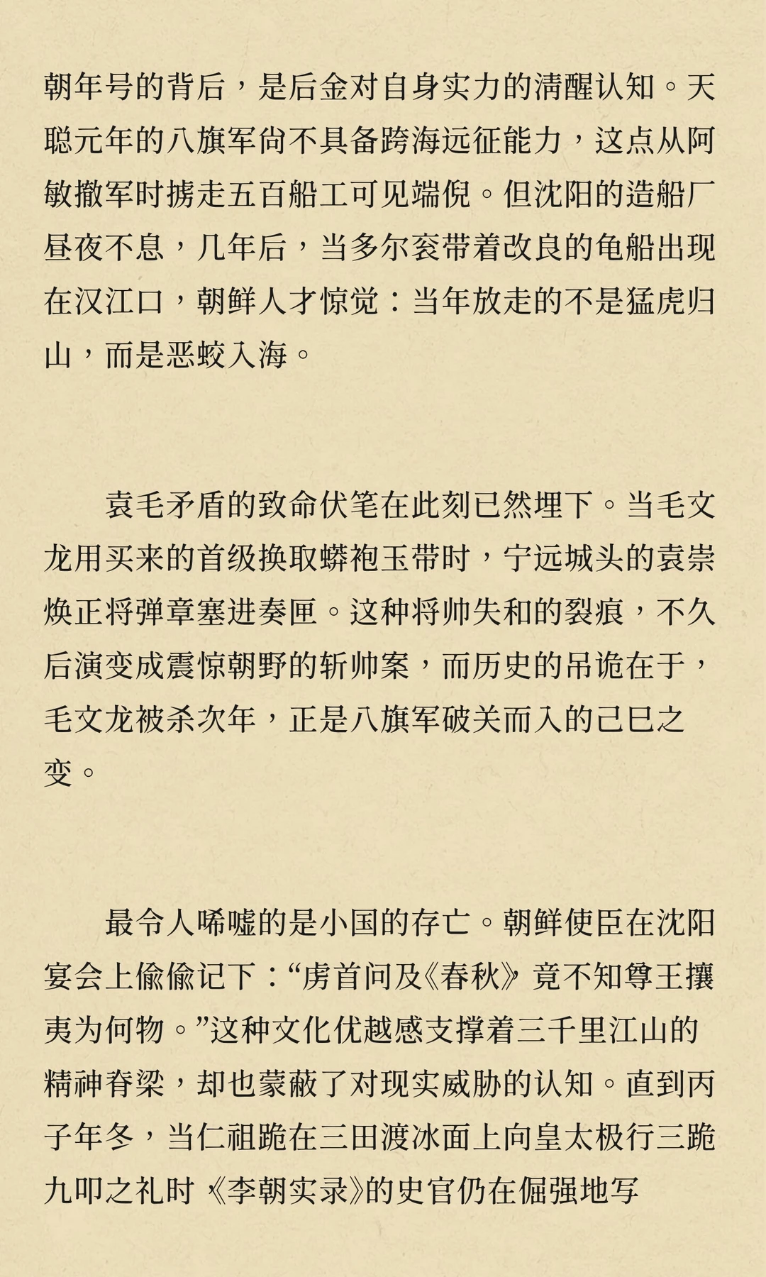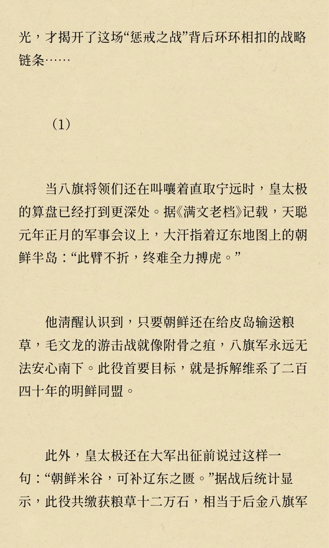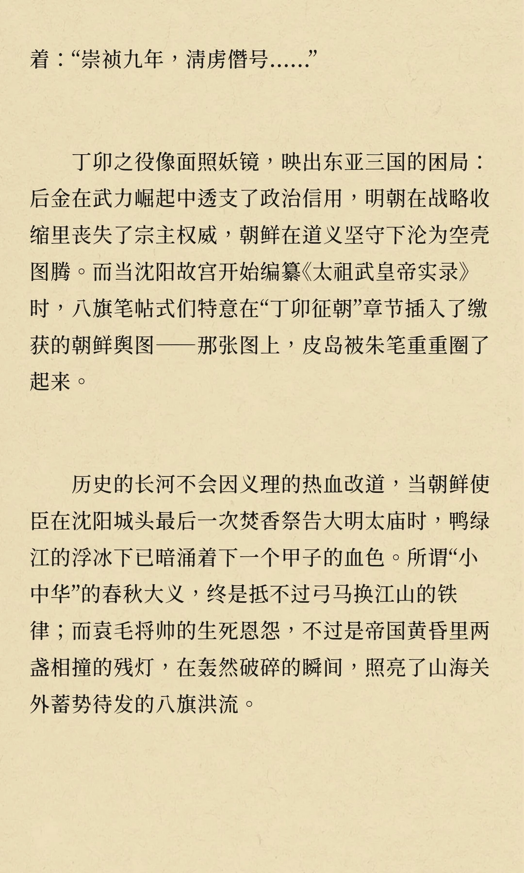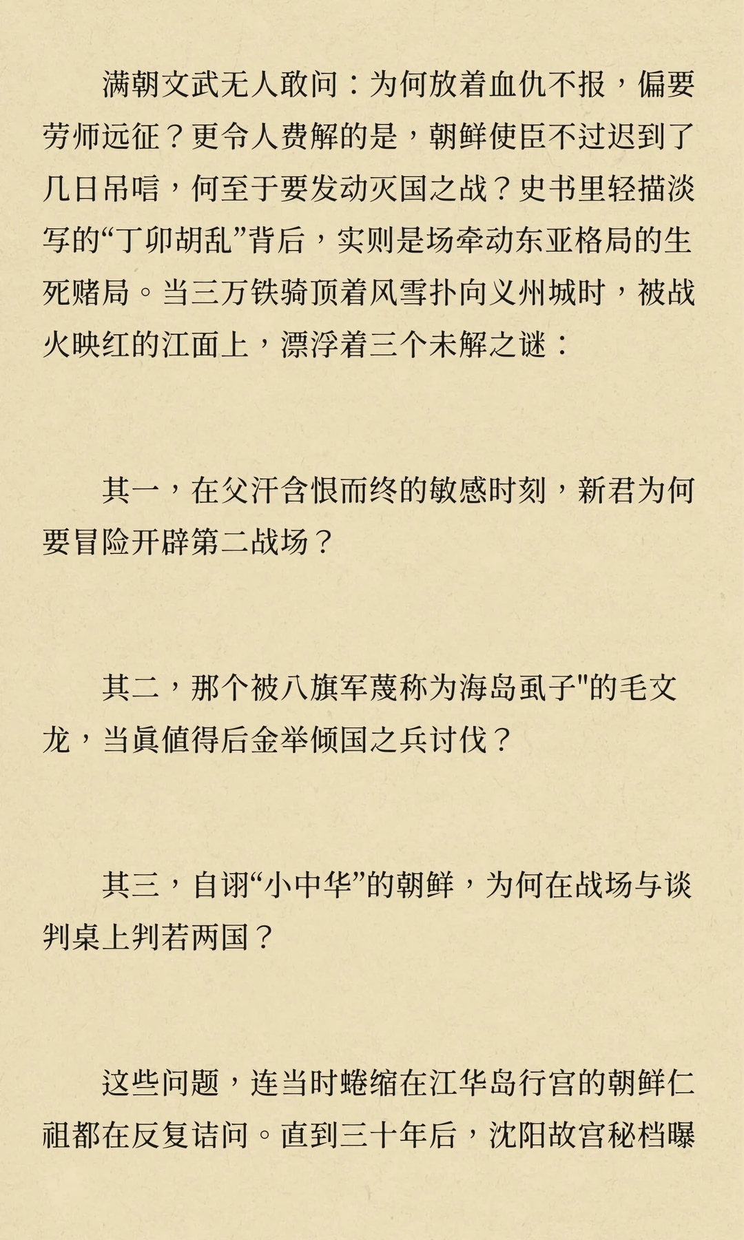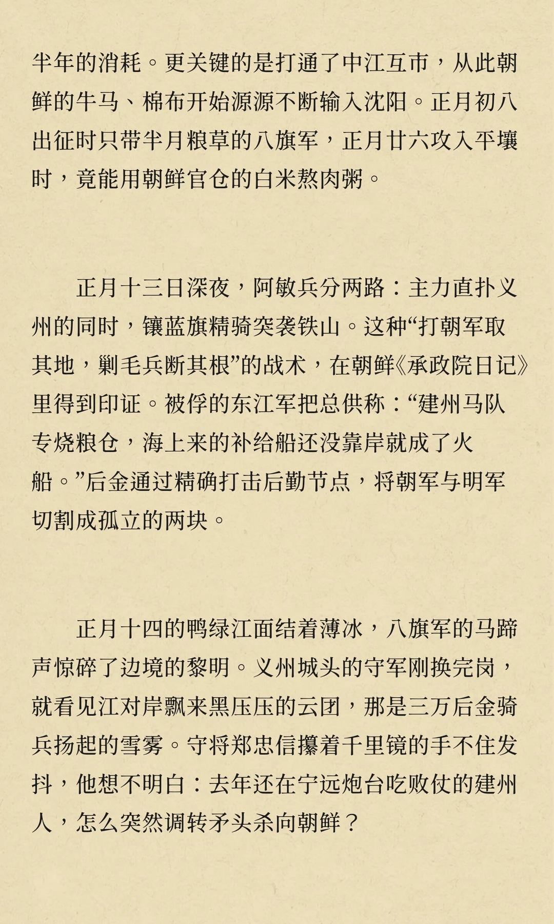皇太极在父汗含恨之际,冒险开辟第二战场,攻占朝鲜,拆解明鲜同盟,打通中江互市,切断毛文龙游击战,展现其战略远见。这场“丁卯胡乱”不仅改变了东亚格局,也埋下了后金崛起的伏笔。