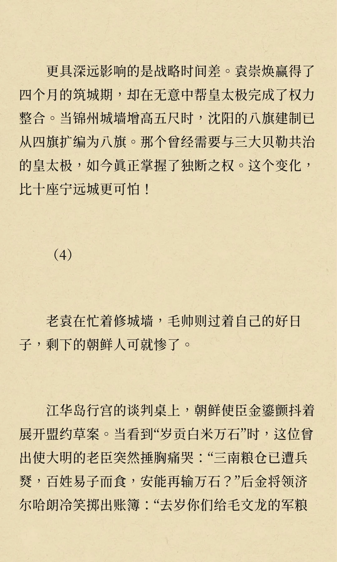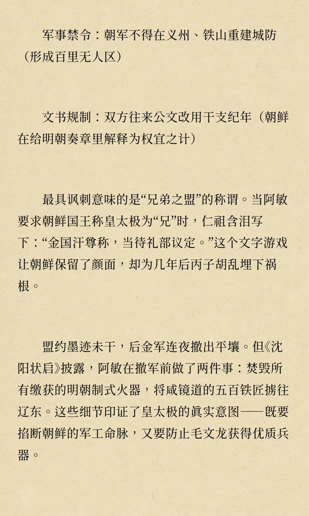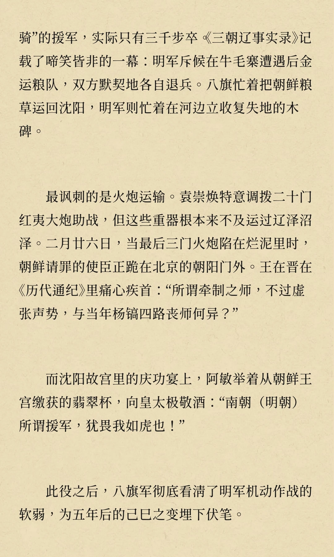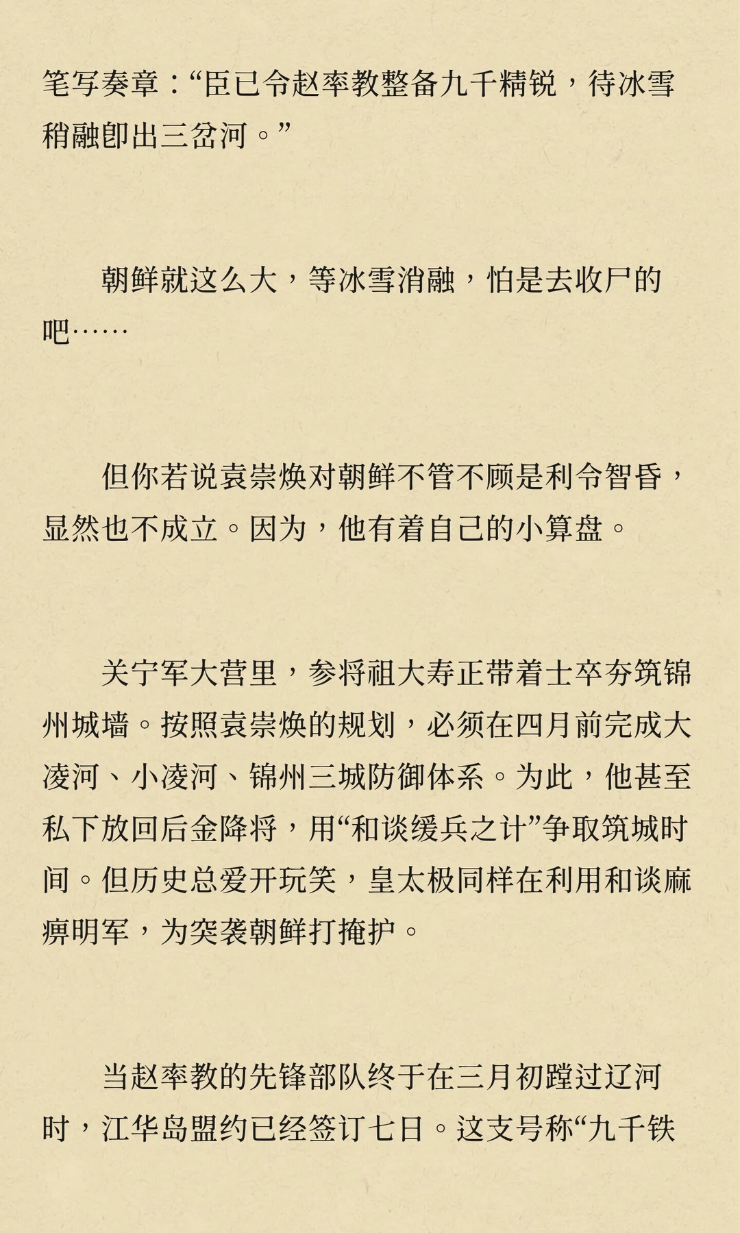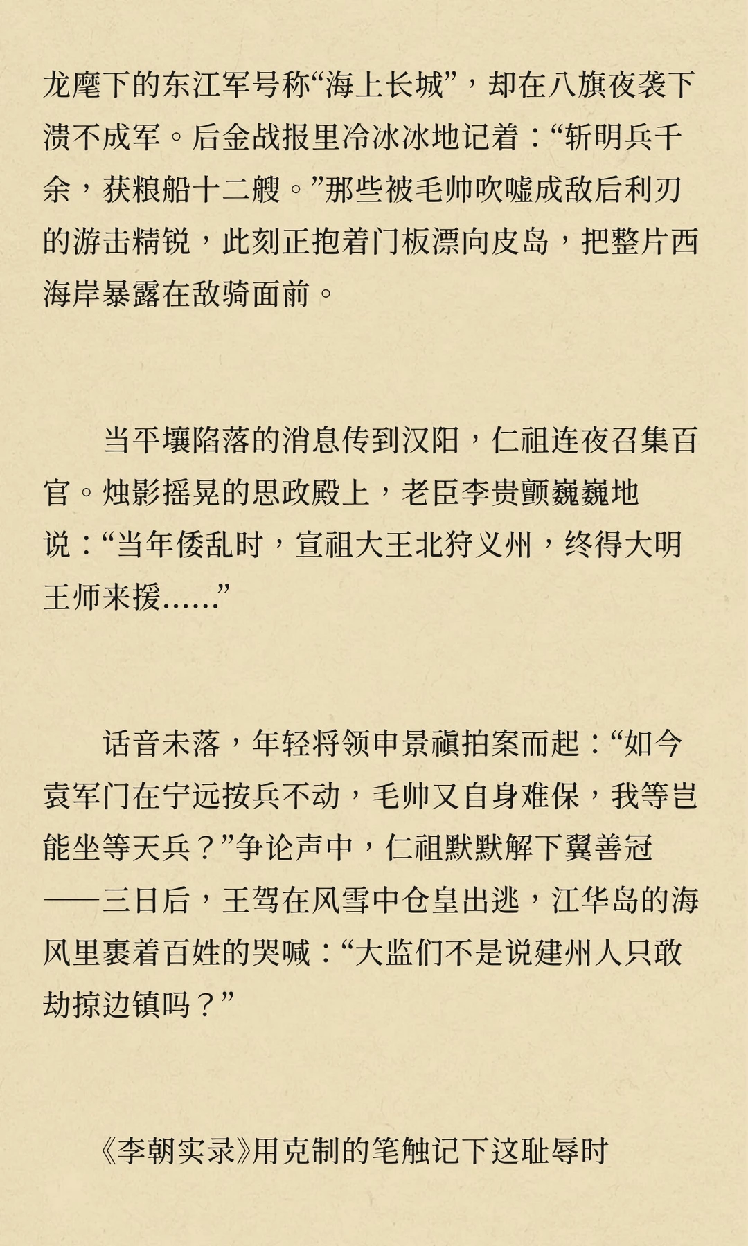 皇太极在父汗含恨之际,冒险开辟第二战场,攻占朝鲜,拆解明鲜同盟,打通中江互市,切断毛文龙游击战,展现其战略远见。这场“丁卯胡乱”不仅改变了东亚格局,也埋下了后金崛起的伏笔。