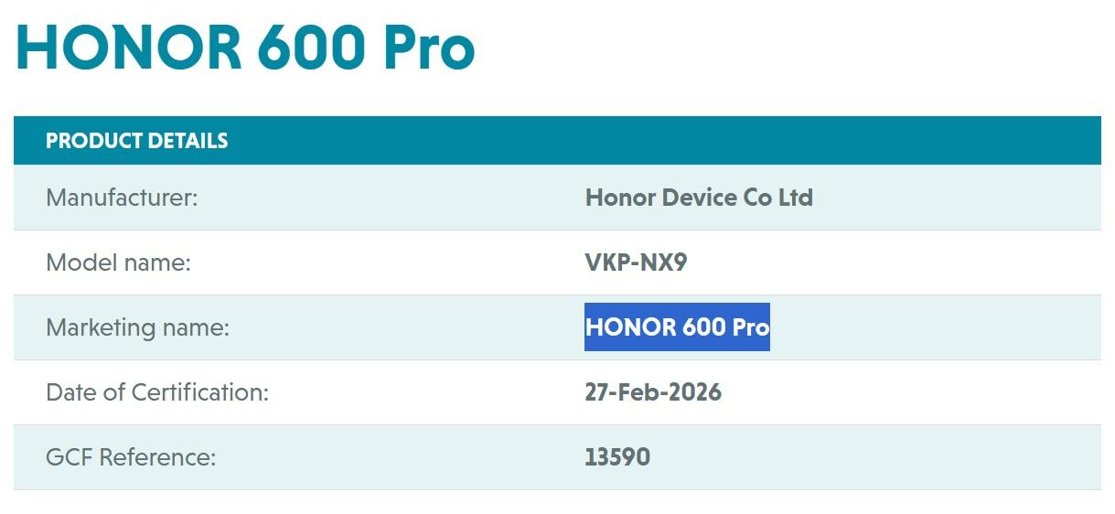 荣耀 600 和荣耀 600 Pro 出现在全球认证论坛(GCF)数据库中。型号分别为 VKJ-NX9 和 VKP-NX9。 标准版采用 6.57 英寸 1.5K 直屏,骁龙 8 至尊版,200MP 主摄,9000+ mAh 青海湖电池,新机预计 5 月发布。