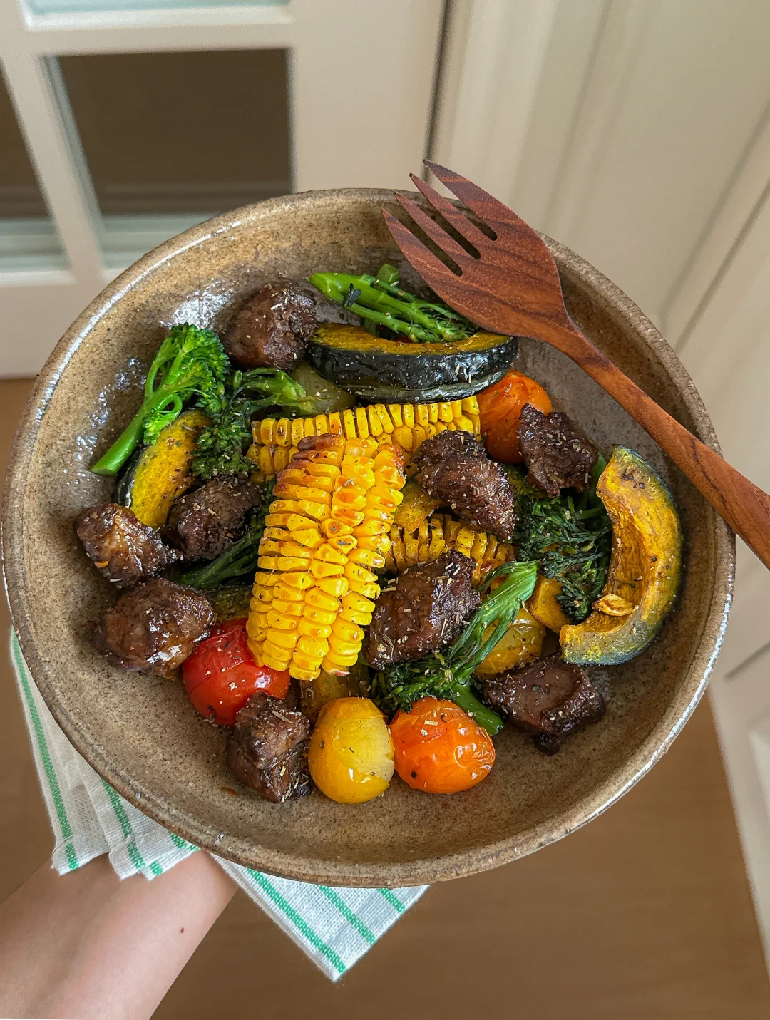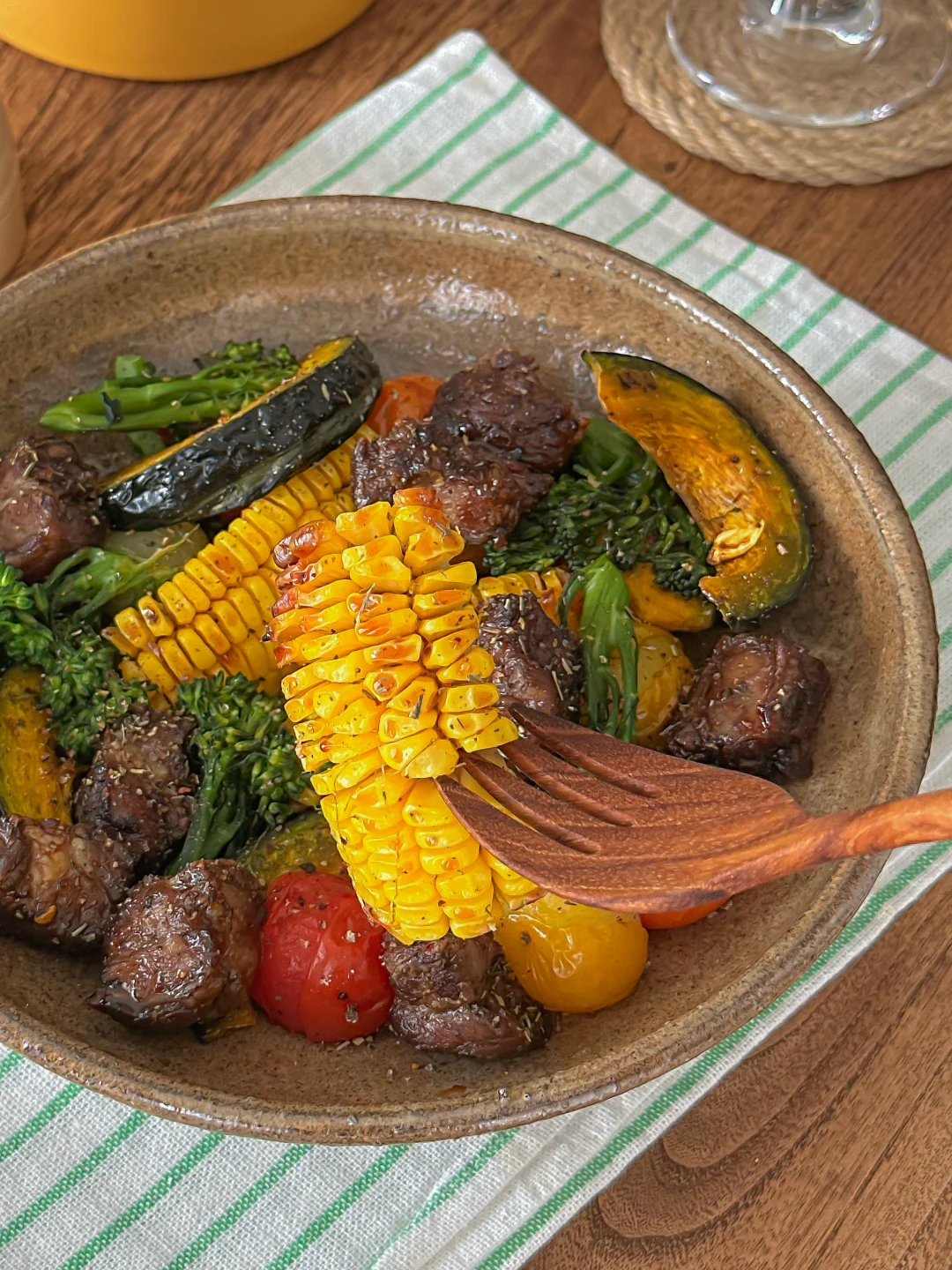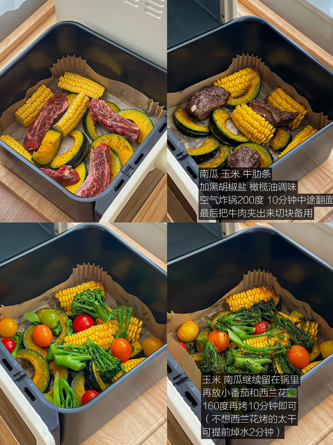 好吃好喜欢😋 十字花科蔬菜🥦 焦香的玉米都是刷脂好搭子! hin喜欢南瓜烤完糯糯的口感 ~ 还有外焦里嫩的牛肋条 搭配小番茄的酸甜清爽又解腻 有蔬菜🥬 蛋白质 营养全面 空气炸锅一锅出! 今晚快做起来吧