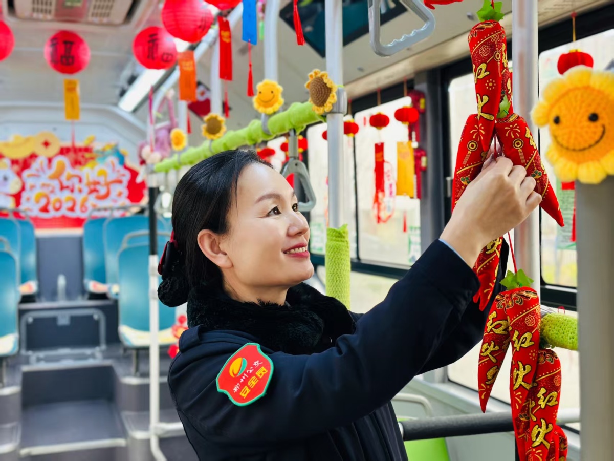 据了解,车厢所有装饰均由车长虎萍利用休息时间采购、亲手布置,灯谜每日更新。除传统文字谜面外,还创新融入简笔画、趣味视频、诗词填空、历史典故等多种形式,部分挂件更是手工钩织完成,以满满匠心拉近与乘客的距离,将十米车厢打造成传递温暖、传播文化的“移动阵地”。