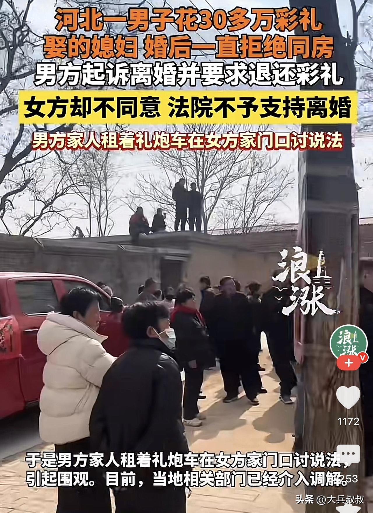 河北邢台,一男子花了30多万彩礼娶的媳妇,因婚后媳妇拒绝同房,穿着衣服睡觉引发男方不满,男方随即提出了离婚,并要求女方退还彩礼以及五金,然而,女方却表示双方有感情不愿意离婚,最终法院判决两人不准离婚,男方无语,随后租来了礼炮车来到女方家门口讨说法。 早就说过彩礼这玩意儿是个坑,偏偏有人不信邪!这不,河北邢台一户人家,30多万砸进去,换来的不是媳妇暖被窝,而是整整十个月的"室友"待遇。最后逼得婆婆站上礼炮车,当街嘶吼控诉,这场面,简直比电视剧还狗血! 于任泽区的某村口处,一辆装饰得喜庆夺目的大红礼炮车,稳稳地停驻在一户人家的门前,似在静静宣告着即将到来的热闹。车上站着个中年妇女,扯着嗓子往外喊,那声音隔着三条街都能听见。她喊的是什么?"婚后十个月,儿媳进门却不入房,睡觉不脱衣,内衣不肯换,甚至连起码的同房都成了奢望。" 好家伙,这话一出,围观群众全傻眼了。结婚十个月,愣是没圆房?这婚结的,跟请了个长期住家保姆有什么区别? 说实话,这事儿要是搁在别人身上,可能忍忍就过去了。然而,问题在于男方家庭为迎娶此位儿媳,可是倾囊以付、真金白银地付出啊!这般投入,着实令人感喟。 2024年2月9日领证那天,光现金彩礼就给了25.78万,再加上五金首饰、手机什么的,零零总总加起来,直接突破30万大关! 30万是什么概念?在邢台农村,这基本上是一个普通家庭大半辈子的血汗钱。很多时候还不够,还得厚着脸皮找亲戚朋友东拼西凑。 结果呢?钱花了,证领了,人进门了,然没了下文。十个月里,这个家成了什么样?分房睡,衣服不脱,内衣不换。女方用一种近乎修行的方式,硬生生在合法夫妻之间筑起了一道铜墙铁壁。 男方憋屈不憋屈?那简直憋屈到姥姥家了!这日子没法过,干脆一纸诉状递到任泽区人民法院,要求离婚,顺便把那30多万彩礼要回来。 男方想得挺美:婚是假的,钱得退回来,天经地义吧?结果法院的判决下来,直接给他浇了一盆冰水。女方在法庭上就一句话:"我们有感情,我不同意离。"就这一句话,案子黄了。 别以为这是法官故意刁难人。《民法典》里写得明明白白,想离婚,要么你得证明对方家暴、赌博、出轨,要么就得实打实分居满两年。 男方说的"不同意同房",这玩意儿怎么取证?难不成在卧室里装摄像头,天天拍媳妇穿着衣服睡觉?这种证据别说法院不认,拍出来自己都觉得荒唐。 女方咬死了"感情没破裂",男方又拿不出硬证据,法官只能按规矩办事:驳回起诉,不准离婚。 这下可好,30万彩礼彻底成了"人质"。 按照法律规定,只有离婚成功了,才能谈彩礼返还的事儿。现在婚都离不成,钱自然一分也别想动。男方要是不服气想再告,对不起,等着吧,6个月之后才能再次起诉。 最为讽刺之处何在?时光悄然流逝,拖得愈久,局势对男方愈发不利,恰似逆水行舟,不进则退,令人唏嘘。等半年后再起诉,婚姻存续时间就从10个月变成一年多了。 按照法院的惯例,共同生活时间越长,彩礼返还比例就越低。这不是明摆着的死循环吗?告也告不赢,拖又拖不起,最后逼得一家人租辆礼炮车上街喊冤。 这就是被法律程序活活卡死的典型案例。现在当地调解部门是介入了,但网上的议论根本停不下来。有人骂女方是"骗婚",拿了钱不办事。 也有人猜测女方可能也是被逼的,用这种方式做最后的反抗。但不管怎么说,这30万是实打实花出去了,这十个月是实打实熬过来了,最后闹成这样,谁是赢家? 男方人财两空,女方名声扫地,两个家庭全被拖进了这场闹剧的泥潭里。而那30万彩礼,就像一副沉甸甸的枷锁,把两个本该各奔前程的人,死死锁在了一起。 这事儿说到底,还是彩礼这个"潜规则"在作妖。当婚姻变成了一场输不起的赌局,当"感情未破裂"成了拖延还钱的万能借口,那点关于爱情和家庭的美好想象,早就被算盘珠子的声音盖得干干净净了。 礼炮车上的嘶吼还在回响,但这场闹剧里,只剩下两个被困在枷锁中、面目模糊的可怜