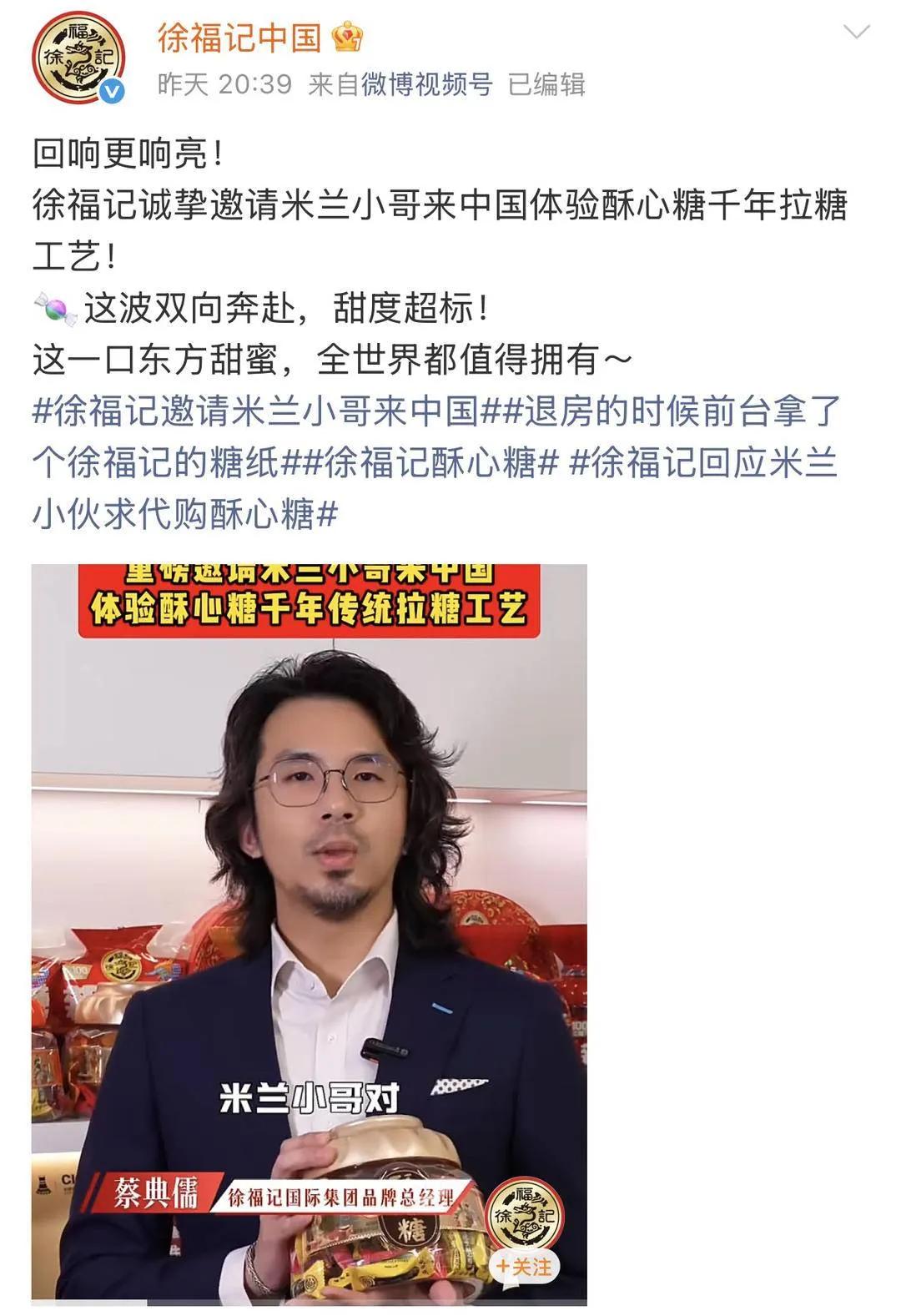 中国的甜蜜品味在意大利米兰的唇齿间,形成了中国与欧洲的甜蜜桥梁 一张糖纸,一份甜蜜的开始。事件缘起于2026年2月17日,一名中国游客在社交媒体发帖表示:自己在意大利米兰中央车站旁的佛罗拉酒店办理退房时,酒店前台小哥小心翼翼掏出一张压扁的徐福记酥心糖糖纸,恳切询问:“下次来米兰,能不能帮我带这个糖?我会付钱!”于是,随着视频的点击,徐福记酥心糖奔向米兰,更多的徐福记酥心糖奔向这位前台哥。 当更多的徐福记酥心糖出现在米兰前台哥的面前时,他高兴地捂住了脸,一种甜蜜暴击,把跨国挚爱演绎出一种国际友谊。甚至有人还拿出来了徐福记酥心糖各种类的成分表,生怕外国人对某一些成分过敏。细致入微,也有只有中国人能做到了。 这个时候无论徐福记是哪个国家的控股,酥心糖都是代表中国的,有人甚至贴心提供了更多的中国酥心糖,让外国人更加深入的了解中国。 当更多的成包、成袋、成集装箱的徐福记酥心糖走在去米兰路上的时候,我们仿佛看到了一个甜蜜的纽带联系中国与欧洲。 不仅如此,徐福记酥心糖是有心的,经营甜蜜的事业之徐福记中国总部已经知道了此事,据说已经联系了前台哥,邀请他来中国访问,来中国看看徐福记酥心糖加工流程与工艺,看看中国美,尝尝中国的甜。前台哥为徐福记酥心糖做了广告,徐福记不会亏待他,他不得有几个甜度加号不能让他回去。 这一波中国流量做得好,不仅有甜蜜,还有传递,更多是中欧之间的那种友谊。所以说,我们每一个人无论在何时何地,是个中国人可能都是中国的形象代表,都是中国文旅的驻外代表,会在不经意之间就把中国推到了新的高度。 徐福记这个故事很甜蜜,说到这里,我怎么感觉作为一个中国人,徐福记酥心糖我也没吃过呀?!