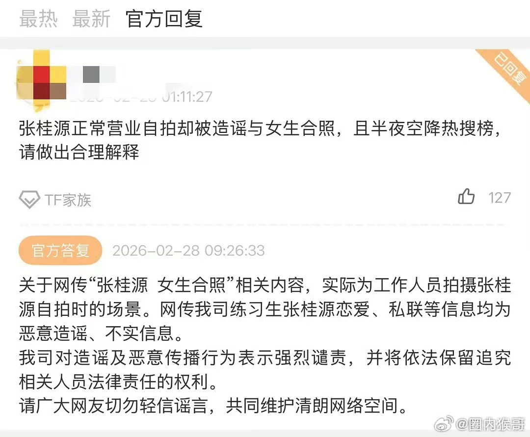时代峰峻高会否认张桂源合照 现在的舆论环境真的是。。。sdfj:该照片是工作人员拍摄张桂源自拍时的场景,更不存在恋爱、私联等不实行为。随随便便就要被大肆🧼💊其它乱七八糟的,唉 合作张桂源 女生合照