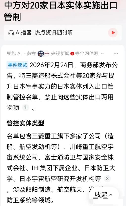 沈逸真是料事如神啊!佩服! 一个星期前,他刚在节目中说:跟日本没有必要对话,第一警告,第二惩戒,第三过红线就打!比如说过完年之后没准就有惊喜。 说实话,当时我听完,心里还嘀咕了一下,惊喜?能有什么惊喜?毕竟这些年,我们对日本的警告、惩戒也不少,但沈逸这么笃定,说过完年就有动静,我还真有点半信半疑。 可谁能想到,沈逸这话刚说完一个星期,惊喜就真的来了,而且来得又快又狠,完全兑现了他的预言! 这不,年后上班的第一天,对日本的惩戒就来了:商务部发布公告,将三菱造船株式会社等20家参与提升日本军事实力的日本实体列入出口管制管控名单,禁止向这些实体出口两用物项,同时还将斯巴鲁株式会社等20家无法核实两用物项最终用户、最终用途的日本实体列入关注名单,两份公告从发布当天就正式实施。 可能有人不清楚,这20家被列入管控名单的实体到底是什么来头,其实它们全是日本军工领域的核心力量,每一家都在帮日本提升军事实力,直接威胁到我国的安全。 就说最受关注的三菱造船株式会社,它可不是普通的造船企业,前身在二战期间就建造过“武藏号”战列舰,是当时日本军国主义的军工支柱,到现在,它还是日本海上自卫队的核心建造商,负责宙斯盾驱逐舰、大鲸级潜艇和“最上级”护卫舰的总装任务,这些舰船很多都被用于钓鱼岛方向的海上侵权,甚至它还帮菲律宾海警建造巡逻舰,专门用于南海方向的挑衅活动。 这次我们的惩戒之所以能起到立竿见影的效果,关键就在于这些日本实体高度依赖中国的关键材料,尤其是两用物项。三菱造船制造舰体所需的高强度特种钢,其稀土添加剂100%来自中国,建造潜艇钛合金壳体的材料,对华依赖度也高达70%,就连雷达系统里的氮化镓组件,也离不开中国供应。 公告发布当天,东京股市就有了反应,防务与重型机械板块遭遇抛售,三菱重工股价由涨转跌,最终收跌3.1%,IHI株式会社下跌5.73%,川崎重工下跌4.02%,足以看出这些企业对中国供应链的依赖程度。按照目前的情况,一旦持续断供,三菱造船在建的宙斯盾驱逐舰、大鲸级潜艇等项目,工期可能会延迟18到24个月,新型舰艇的研发成本也会上涨40%以上,就连日本的航母改装计划都可能被迫暂停。 其实这次的惩戒并不是突然出手,早在今年1月6日,我国就已经宣布加强两用物项对日本的出口管制,这次是加强管制后首次点名具体企业,也是对日本近期一系列危险举动的精准反制。 最近一段时间,日本首相高市早苗多次发表涉台错误言论,暗示要军事介入台海问题,而且日本政府还在去年12月通过了创纪录的防卫预算,不断扩充军力,推进“再军事化”,甚至研制“岛屿防御用高速滑翔弹”等进攻性武器,这些举动都已经触碰了我国的红线。 面对我们的惩戒,日本政府反应激烈,内阁官房副长官佐藤启在当天的记者会上表示,中方的做法“绝对不可接受,极其令人遗憾”,还向我国提出强烈抗议,要求撤回决定,日本外务省相关官员也向中国驻日大使馆进行了交涉。 但我国外交部和商务部早已明确表态,这次的措施完全是依法依规,目的就是制止日本的“再军事化”和拥核企图,正当、合理、合法,而且这些措施只针对参与提升日本军事实力的少数实体,不影响中日正常的经贸往来,诚信守法的日本实体根本不用担忧。 以前我们对日本的警告和惩戒,很多人觉得力度不够,可这次不一样,我们精准锁定了日本军工产业的“命门”,不搞泛泛而谈,直接针对具体实体下手,既体现了我们的克制,又展现了我们的决心。 这次的惩戒只是一个开始,只要日本继续推进“再军事化”,继续触碰我国的红线,我们还会有更多针对性的措施。我们不主动挑事,但也绝对不怕事,日本越是挑衅,我们的反制就会越精准、越有力,这就是大国的底气。
