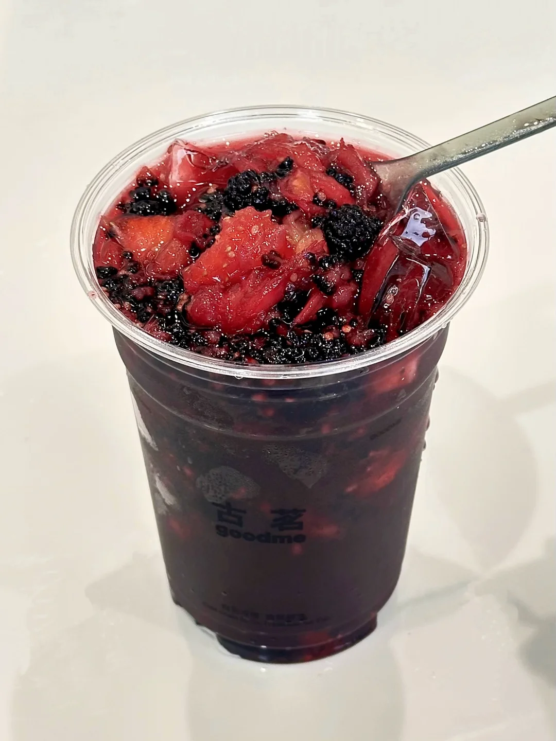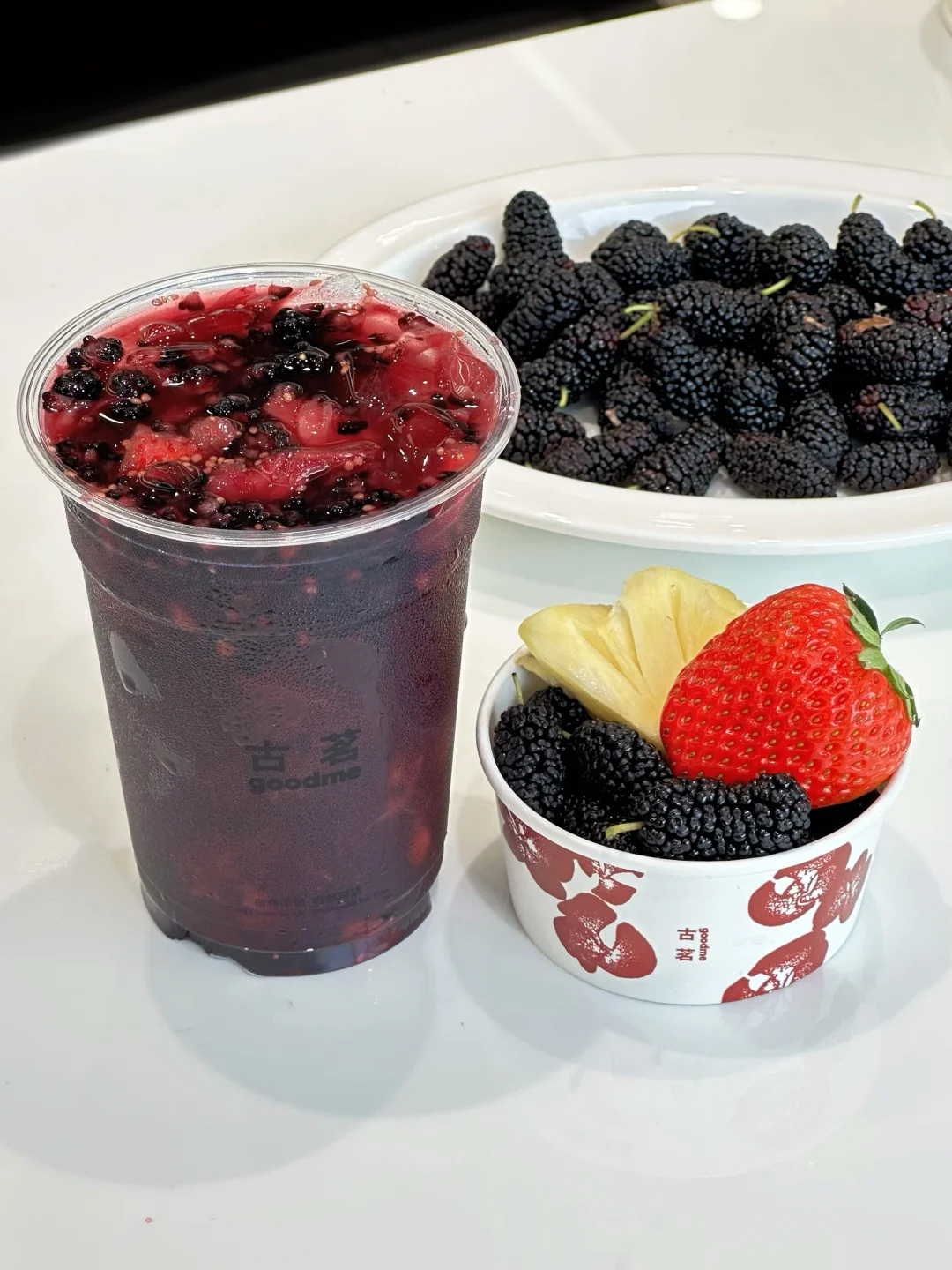 半杯都是新鲜果肉,有桑葚,草莓,还有凤梨!桑葚那种饱满多汁的甜,一点都没有掺水感,喝起来就是很真实的鲜果香气。而且每一颗都是现剥去梗的,直接在嘴里爆汁,再加上草莓的酸甜和新鲜凤梨的清爽,酸甜适中~