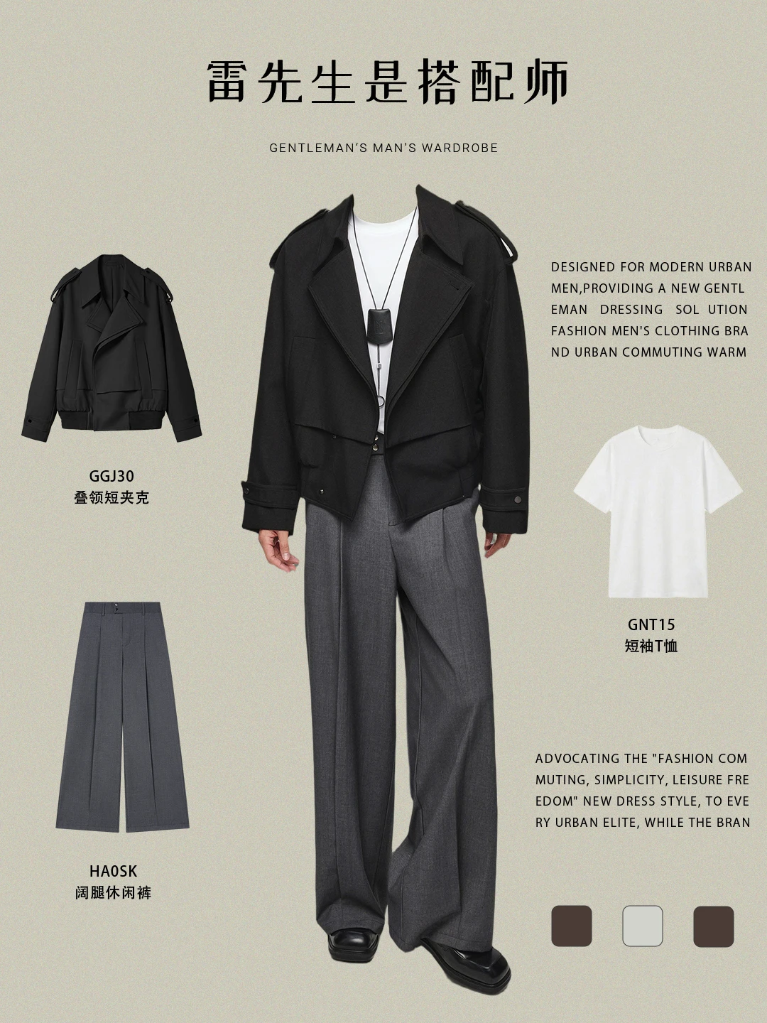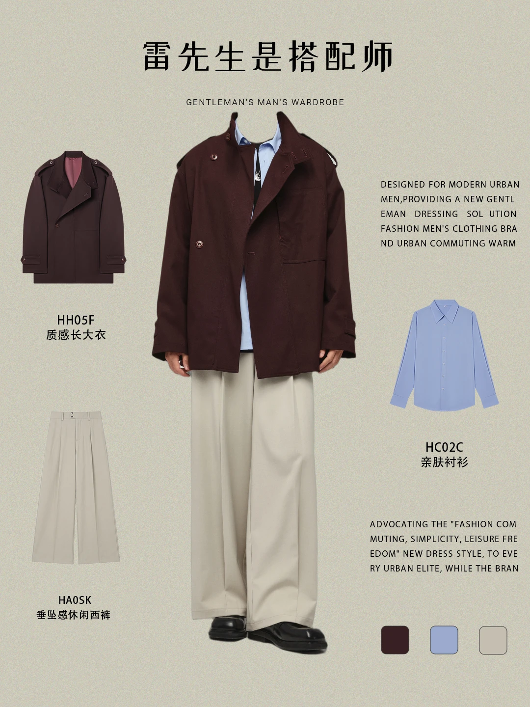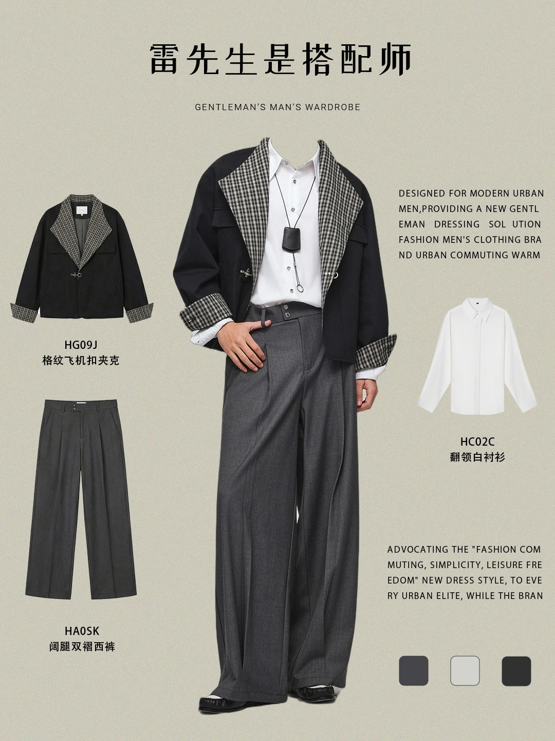 1️⃣ 想显高穿这套: 格纹短夹克 (HG09J) + 高腰阔腿裤。短上衣拉高腰线,视觉上比例无敌。 2️⃣ 见客户穿这套: 质感西服 (HM01X) + 丁香紫衬衫。紫色打破了黑色的沉闷,显得你既专业又很有品位。 3️⃣ 搞定约会穿这套: 酒红大衣 (HH05F) + 米白西裤。这套真的绝了,温润如玉的暖男感,女生好感度拉满。 4️⃣ 日常搬砖穿这套: 仿牛仔夹克 (HG21J) + 咖色休闲裤。耐造又好看,下班直接去撸串也不违和。