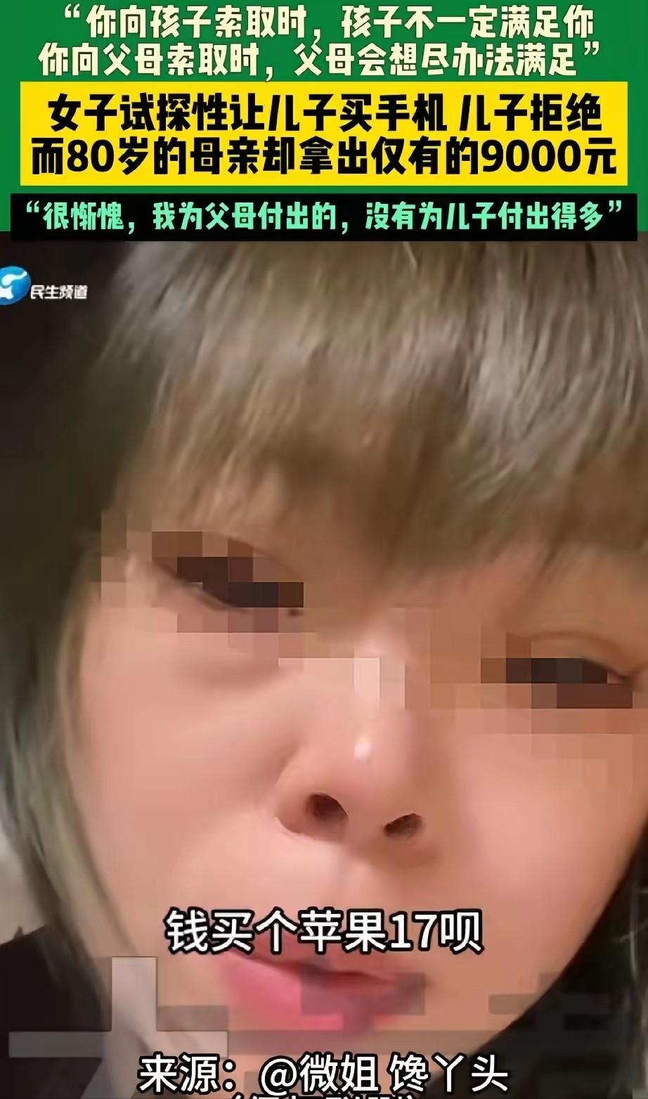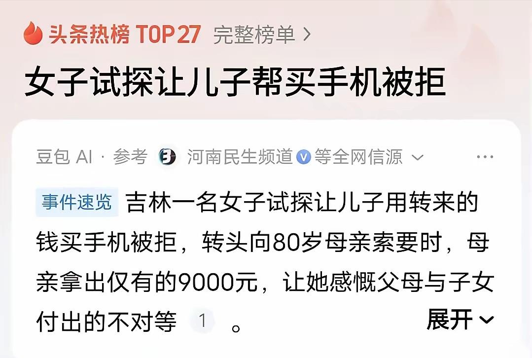 “可怜天下父母心!”吉林,女子收到儿子转的18000块钱,让她帮忙存起来,女子试探儿子问:我能拿这钱买个苹果17吗?儿子直摇头,拒绝道:不行,我好不容易攒的。下午,女子去80多岁的老母亲家,又试探说:妈,给我一万块钱,我想买手机。老母亲面露难色,说不太够啊。随后的做法却让女子瞬间泪目! 这笔钱是儿子工作两年一点点攒下来的积蓄,他在外租房生活,每个月工资扣掉房租和日常开销,能留下来的并不多。 转账时他特意叮嘱母亲帮忙保管,说是留着以后应急用,放在自己手里怕忍不住花掉。 女子看到金额时心里很欣慰,觉得孩子终于有了规划,也能为未来打算。 她的手机用了好几年,还是儿子当年淘汰下来的旧款,屏幕有裂痕,运行也开始卡顿。 一时起意,她给儿子打了电话,语气轻松地提起想换新手机,问能不能从那笔钱里拿一部分出来。 电话那头的儿子没有犹豫,态度很明确,表示这笔钱是自己的储备金,不能动。 女子听完只是笑着说开玩笑,挂断后却坐在沙发上发了会儿呆。 她想起儿子小时候想要玩具车,她节省半个月生活费给他买下。 上大学那年需要电脑,她把自己攒下的存款全部拿出来。 那时候她从没考虑值不值得,只觉得孩子需要。 下午她照常去看望八十多岁的母亲,顺路买了水果和点心。 老人独自住在老小区里,腿脚不算利索,平日生活简单,钱都存在抽屉里的小盒子里。 母女闲聊一阵,她顺口说起想换手机,试探着问母亲能不能拿出一万元。 老人皱了皱眉,说自己手头只有八千多,是平时省下来的养老钱。 话音刚落,老人已经起身去里屋翻找,拿出用手帕包着的一沓零钱和整钞,一张张慢慢清点。 她把能拿出来的钱都摆在桌上,说不够的话再想办法凑。 女子看着母亲布满皱纹的手,忽然说不出话来。 上午被拒绝的那点失落,在这一刻被放大,又被另一种情绪覆盖。 她赶紧把钱推回去,说只是随口一提,自己有能力买手机。 老人却执意让她收下,说自己年纪大了花不了多少,只要女儿过得顺心就好。 女子眼泪止不住往下掉,她意识到自己这些年更多心思放在儿子身上,对母亲的照顾却远不如母亲当年对她。 这段经历被她记录下来发到网上,引来不少讨论。 有人说父母的爱总是向下延伸,子女成年后开始为自己考虑,本就是成长的一部分。 也有人提醒,金钱归属有边界,儿子把钱交给母亲保管,所有权仍在自己,母亲无权擅自支配。 按照民法典的规定,财产由所有人自主决定用途,成年子女对父母的赡养义务主要体现在生活照料和必要支出,并非满足一切消费愿望。 女子后来想明白,儿子拒绝并非冷漠,而是对自己积蓄负责。 母亲愿意倾尽所有,也不是义务,而是出于本能的疼爱。 同样的一句话,在不同身份面前,分量完全不同。 那天傍晚,她陪母亲多坐了一会儿,帮老人整理屋子,临走时把那八千多元重新放回抽屉。 回家的路上,雪停了,街道被阳光照得发亮。 她给儿子发去消息,叮嘱他好好工作,钱自己留着。 又约好周末带母亲去做体检。 亲情经不起刻意试探,真正需要的不是一次转账,而是日常的陪伴和体谅。