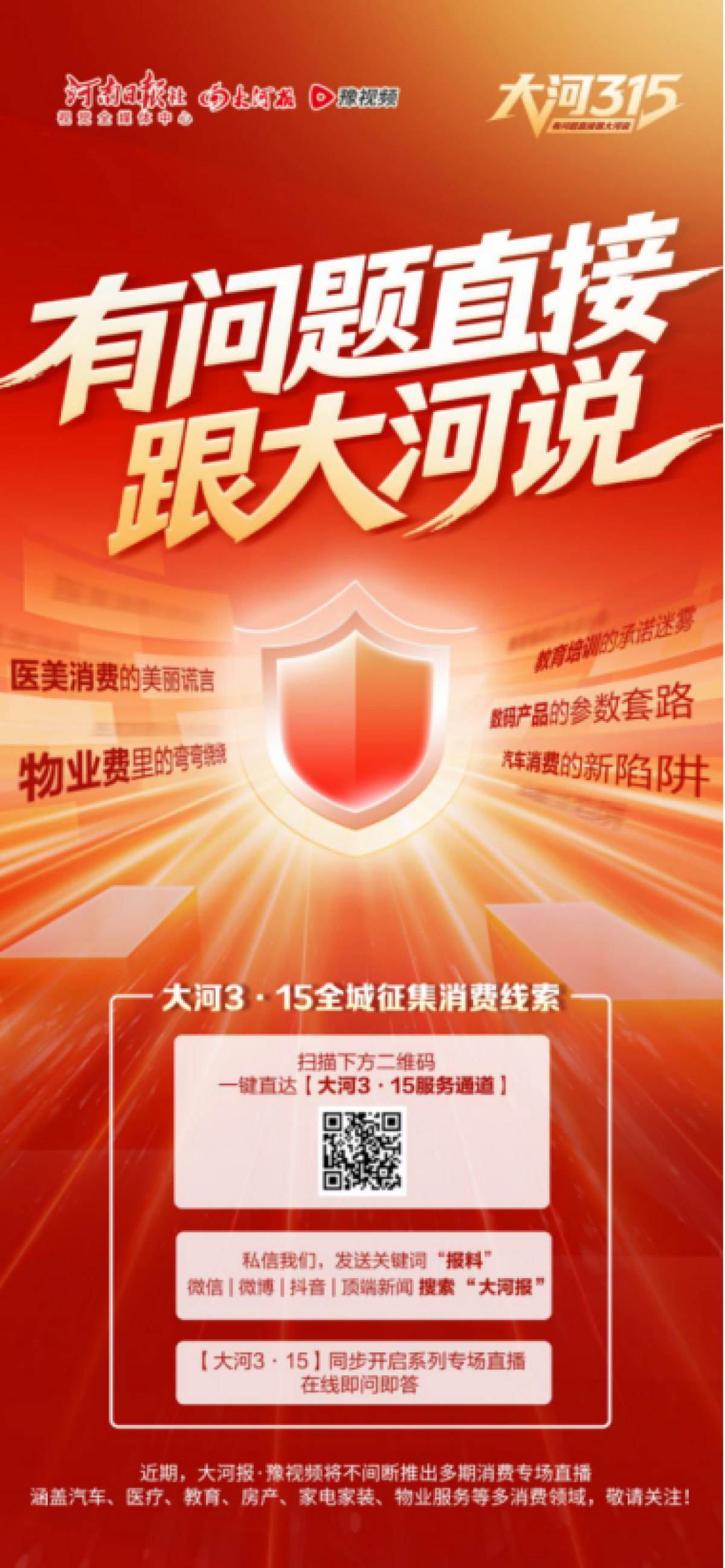 如果您在河南医美消费过程中,遇到非法行医、虚假宣传、价格欺诈、医美贷陷阱、术后维权难、产品假冒伪劣等问题,或是想知道如何分辨医美机构是否靠谱?该如何规避医美消费中的“隐藏陷阱”,都可以扫描二维码直达“大河3·15”服务通道说出您的诉求,或蹲守大河报直播间即问即答,也可在微博、微信、抖音、顶端新闻客户端搜索“大河报”,私信留下维权诉求及联系方式!有问题直接跟大河说!