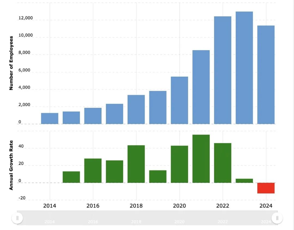 于是,从2024年开始,Block已经开始削减人数,从1.2万人的高位,降至1万人左右;最终在2月的大裁员里,让雇员人数重新回到6000人左右。