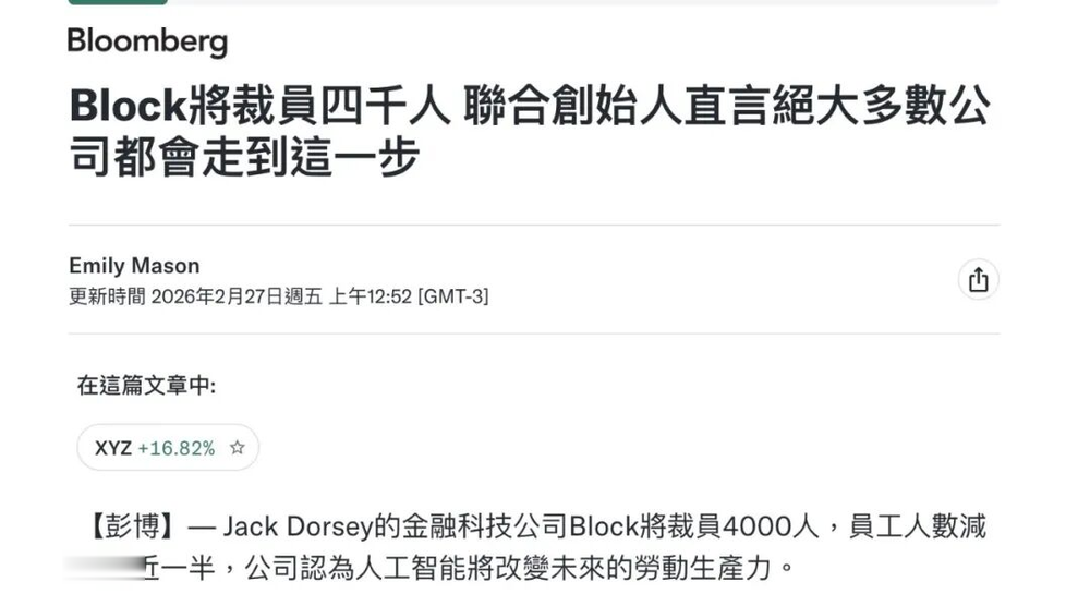 外媒Reuters的分析师称,这是“AI时代的一个seminalmoment(标志性时刻)”,因为Block把AI嵌入运营、主动重构组织,股价因此大涨。
