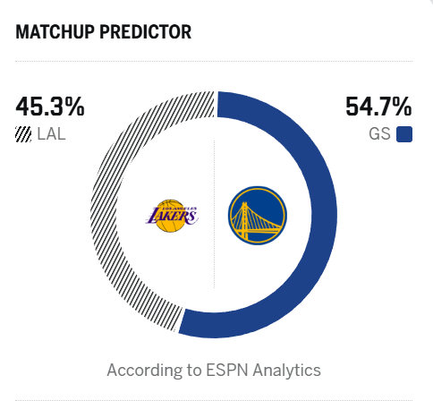 赛前,美媒ESPN预测本场比赛,勇士胜率54.7%,湖人胜率45.3%。
